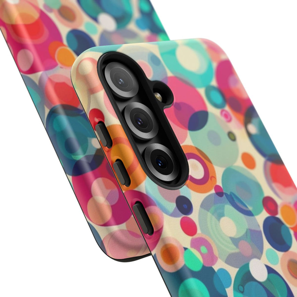 Dit hoesje heeft een opvallend patroon van overlappende cirkels in verschillende maten en kleuren. De cirkels zijn uitgevoerd in tinten blauw, roze, oranje, rood en paars, wat zorgt voor een levendig en dynamisch geheel. De zachte, licht beige achtergrond laat de kleuren extra goed uitkomen. Het patroon is gedrukt op een mat hoesje van polycarbonaat en TPU, dat bestaat uit twee beschermende lagen en geschikt is voor draadloos opladen. Het abstracte en speelse ontwerp geeft je telefoon een kleurrijke uitstraling.