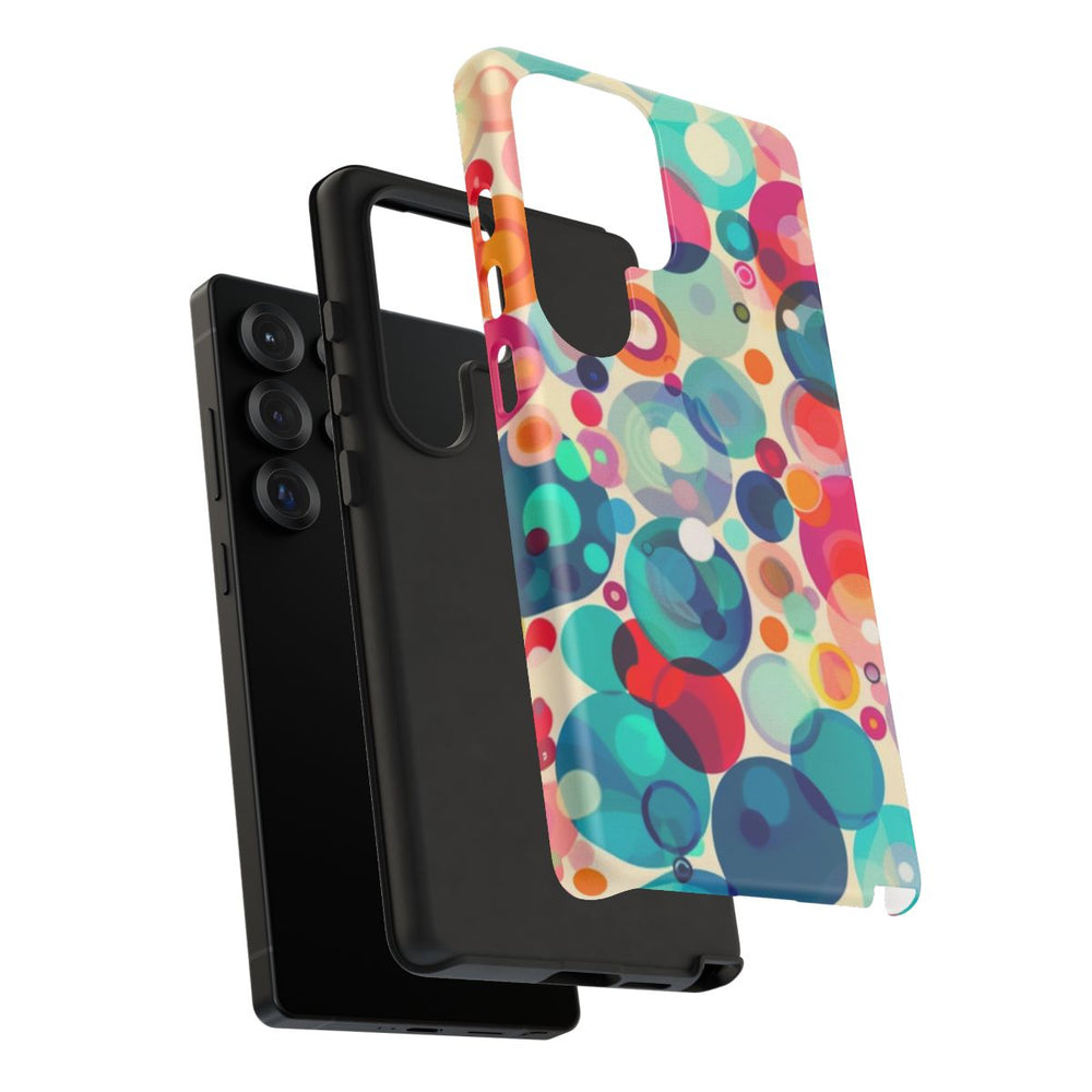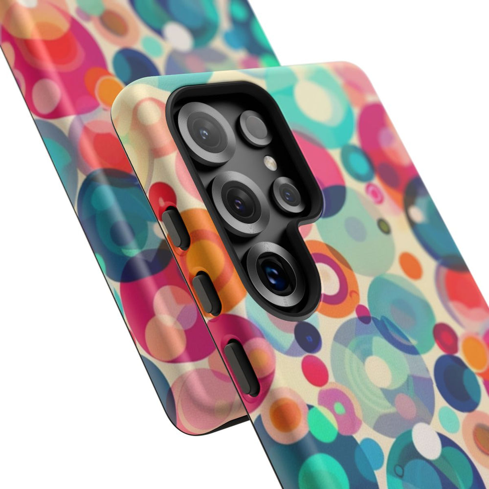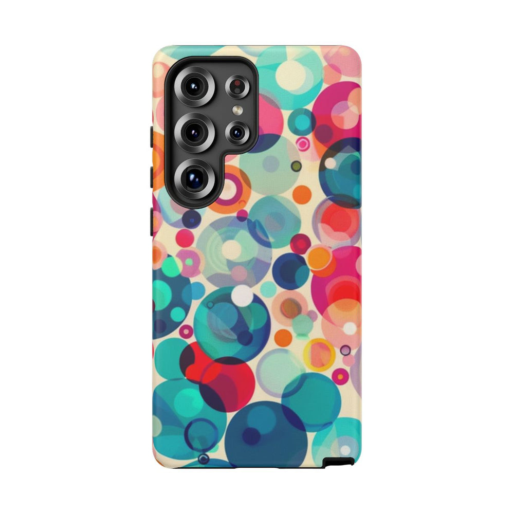 Dit hoesje heeft een opvallend patroon van overlappende cirkels in verschillende maten en kleuren. De cirkels zijn uitgevoerd in tinten blauw, roze, oranje, rood en paars, wat zorgt voor een levendig en dynamisch geheel. De zachte, licht beige achtergrond laat de kleuren extra goed uitkomen. Het patroon is gedrukt op een mat hoesje van polycarbonaat en TPU, dat bestaat uit twee beschermende lagen en geschikt is voor draadloos opladen. Het abstracte en speelse ontwerp geeft je telefoon een kleurrijke uitstraling.