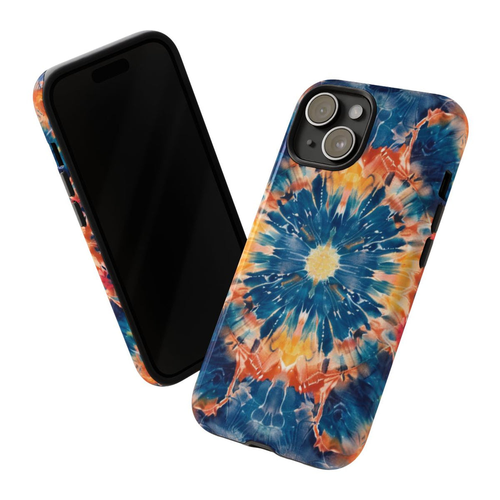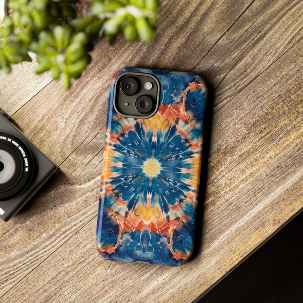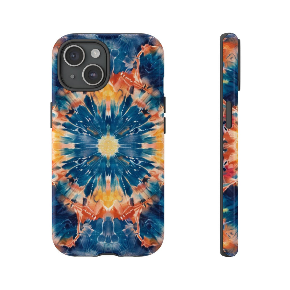 Dit telefoonhoesje heeft een opvallend tie-dye mandala patroon met een symmetrische, radiale opbouw. Diepe blauwtinten, heldere oranje- en geeltinten en subtiele accenten van roze en koraal vloeien naadloos in elkaar over, wat zorgt voor een levendig en dynamisch effect. Het patroon straalt vanuit het midden en geeft een gevoel van beweging en energie. Het glanzende, stevige hoesje bestaat uit een dubbele laag van polycarbonaat en TPU, waardoor je telefoon extra goed beschermd is. Geschikt voor draadloos opladen.