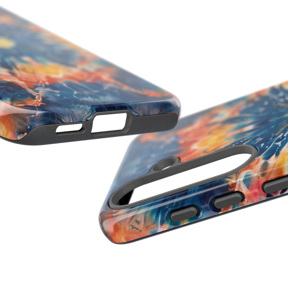 Dit telefoonhoesje heeft een opvallend tie-dye mandala patroon met een symmetrische, radiale opbouw. Diepe blauwtinten, heldere oranje- en geeltinten en subtiele accenten van roze en koraal vloeien naadloos in elkaar over, wat zorgt voor een levendig en dynamisch effect. Het patroon straalt vanuit het midden en geeft een gevoel van beweging en energie. Het glanzende, stevige hoesje bestaat uit een dubbele laag van polycarbonaat en TPU, waardoor je telefoon extra goed beschermd is. Geschikt voor draadloos opladen.