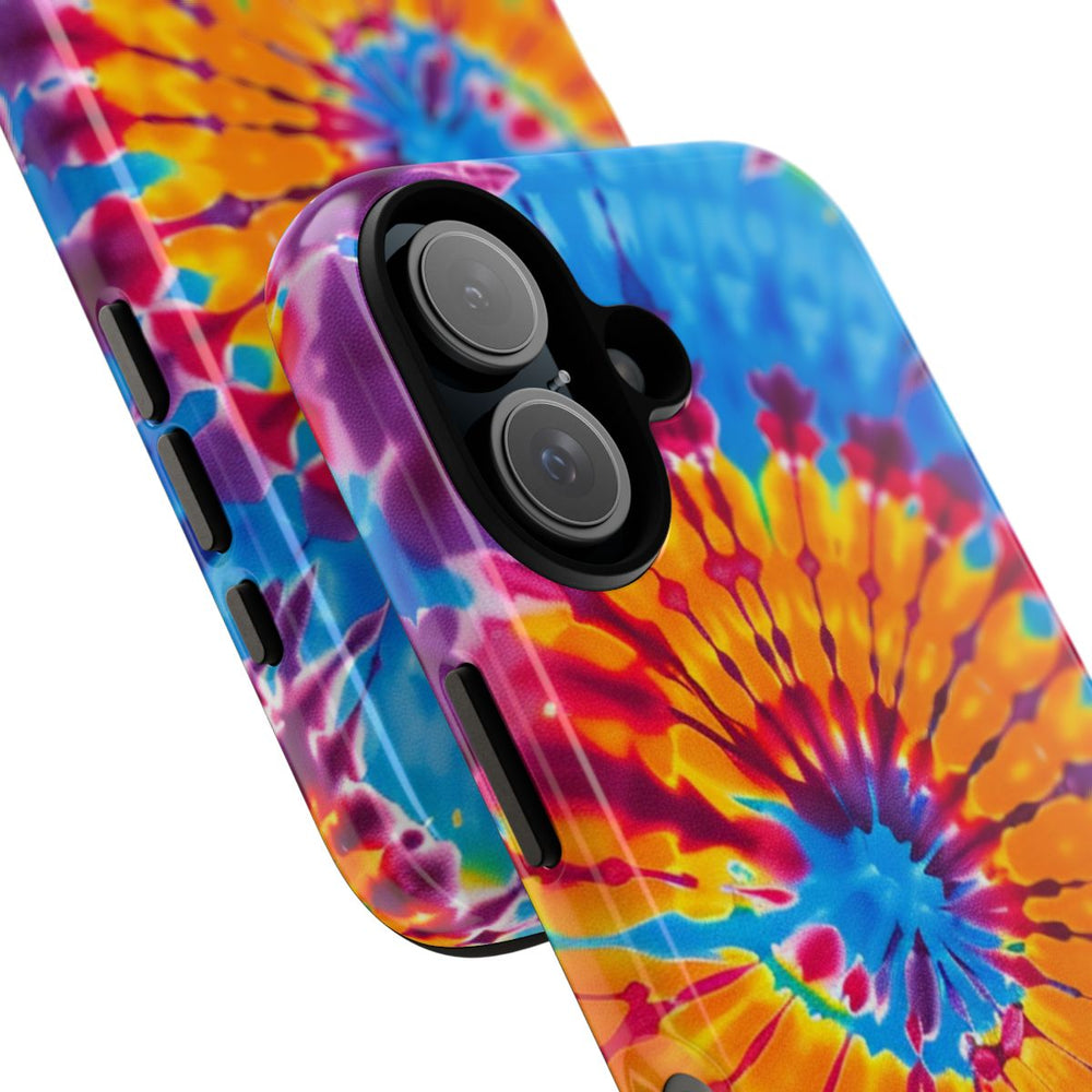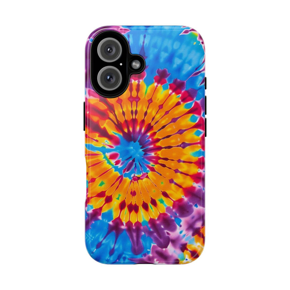 Dit telefoonhoesje heeft een opvallend tie-dye spiraalpatroon met heldere kleuren zoals blauw, geel, oranje, paars en rood. De kleuren stralen in cirkelvormige banen naar buiten, wat zorgt voor een dynamisch en energiek effect. Het hoesje is voorzien van een glanzende afwerking en bestaat uit een stevige polycarbonaat buitenkant met een TPU binnenzijde voor dubbele bescherming. Het hoesje ondersteunt draadloos opladen en is bestand tegen weersinvloeden, waardoor het zijn uitstraling langdurig behoudt.