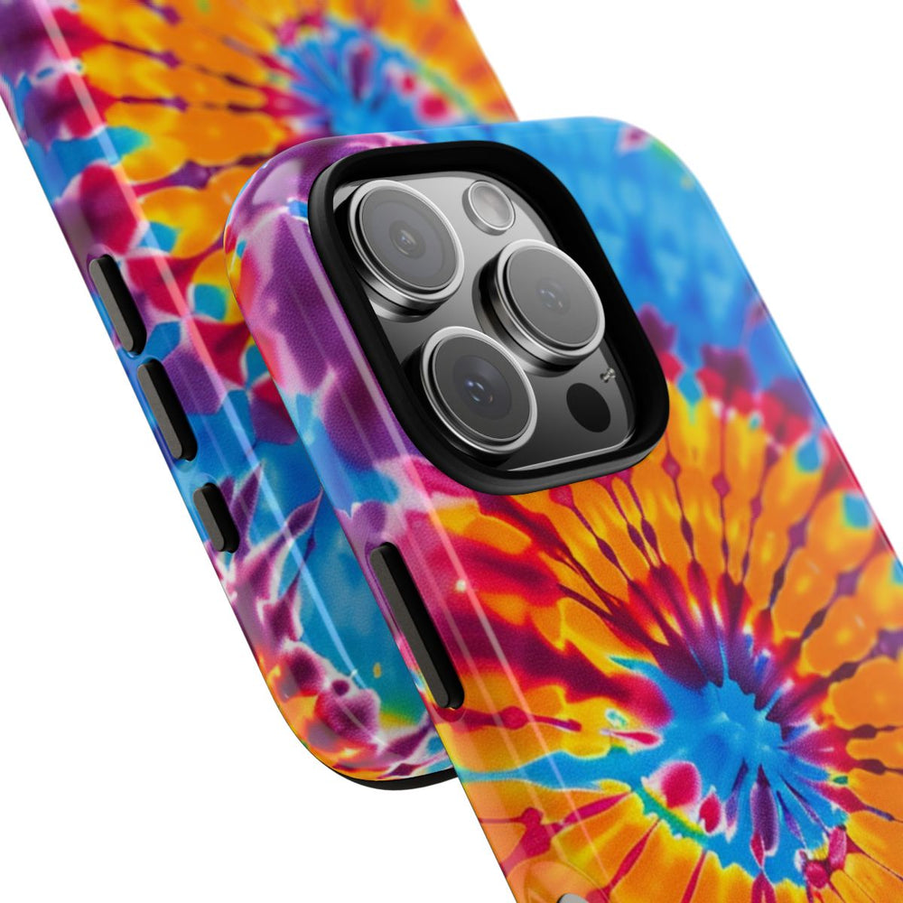 Dit telefoonhoesje heeft een opvallend tie-dye spiraalpatroon met heldere kleuren zoals blauw, geel, oranje, paars en rood. De kleuren stralen in cirkelvormige banen naar buiten, wat zorgt voor een dynamisch en energiek effect. Het hoesje is voorzien van een glanzende afwerking en bestaat uit een stevige polycarbonaat buitenkant met een TPU binnenzijde voor dubbele bescherming. Het hoesje ondersteunt draadloos opladen en is bestand tegen weersinvloeden, waardoor het zijn uitstraling langdurig behoudt.