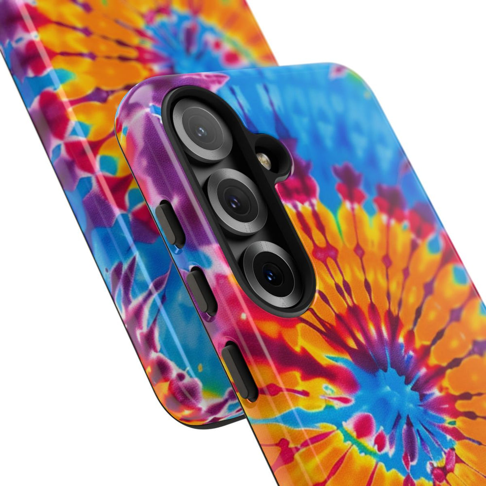 Dit telefoonhoesje heeft een opvallend tie-dye spiraalpatroon met heldere kleuren zoals blauw, geel, oranje, paars en rood. De kleuren stralen in cirkelvormige banen naar buiten, wat zorgt voor een dynamisch en energiek effect. Het hoesje is voorzien van een glanzende afwerking en bestaat uit een stevige polycarbonaat buitenkant met een TPU binnenzijde voor dubbele bescherming. Het hoesje ondersteunt draadloos opladen en is bestand tegen weersinvloeden, waardoor het zijn uitstraling langdurig behoudt.