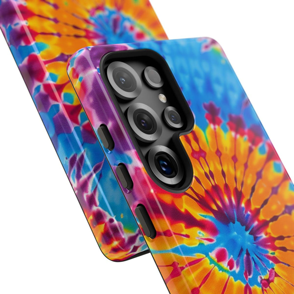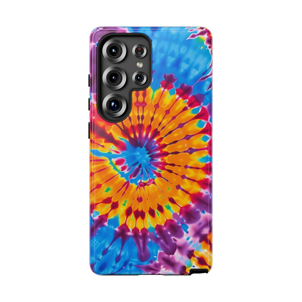 Dit telefoonhoesje heeft een opvallend tie-dye spiraalpatroon met heldere kleuren zoals blauw, geel, oranje, paars en rood. De kleuren stralen in cirkelvormige banen naar buiten, wat zorgt voor een dynamisch en energiek effect. Het hoesje is voorzien van een glanzende afwerking en bestaat uit een stevige polycarbonaat buitenkant met een TPU binnenzijde voor dubbele bescherming. Het hoesje ondersteunt draadloos opladen en is bestand tegen weersinvloeden, waardoor het zijn uitstraling langdurig behoudt.