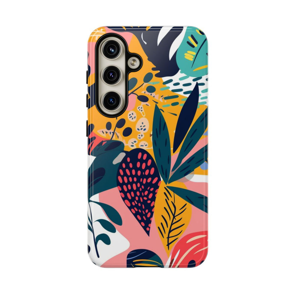 Dit telefoonhoesje is voorzien van een kleurrijk en levendig patroon met tropische bladeren in diverse vormen en maten. De bladeren zijn geïllustreerd in opvallende kleuren zoals donkerblauw, koraal, teal, geel en roze, en liggen over een achtergrond met abstracte vormen. Het geheel zorgt voor een zomerse en energieke uitstraling. Het hoesje heeft een glanzende afwerking en bestaat uit twee lagen: een stevige polycarbonaat buitenkant en een TPU-binnenzijde voor extra stevigheid en bescherming. Het hoesje ondersteunt draadloos opladen en is uitstekend bestand tegen weersinvloeden, waardoor de heldere uitstraling langdurig behouden blijft.