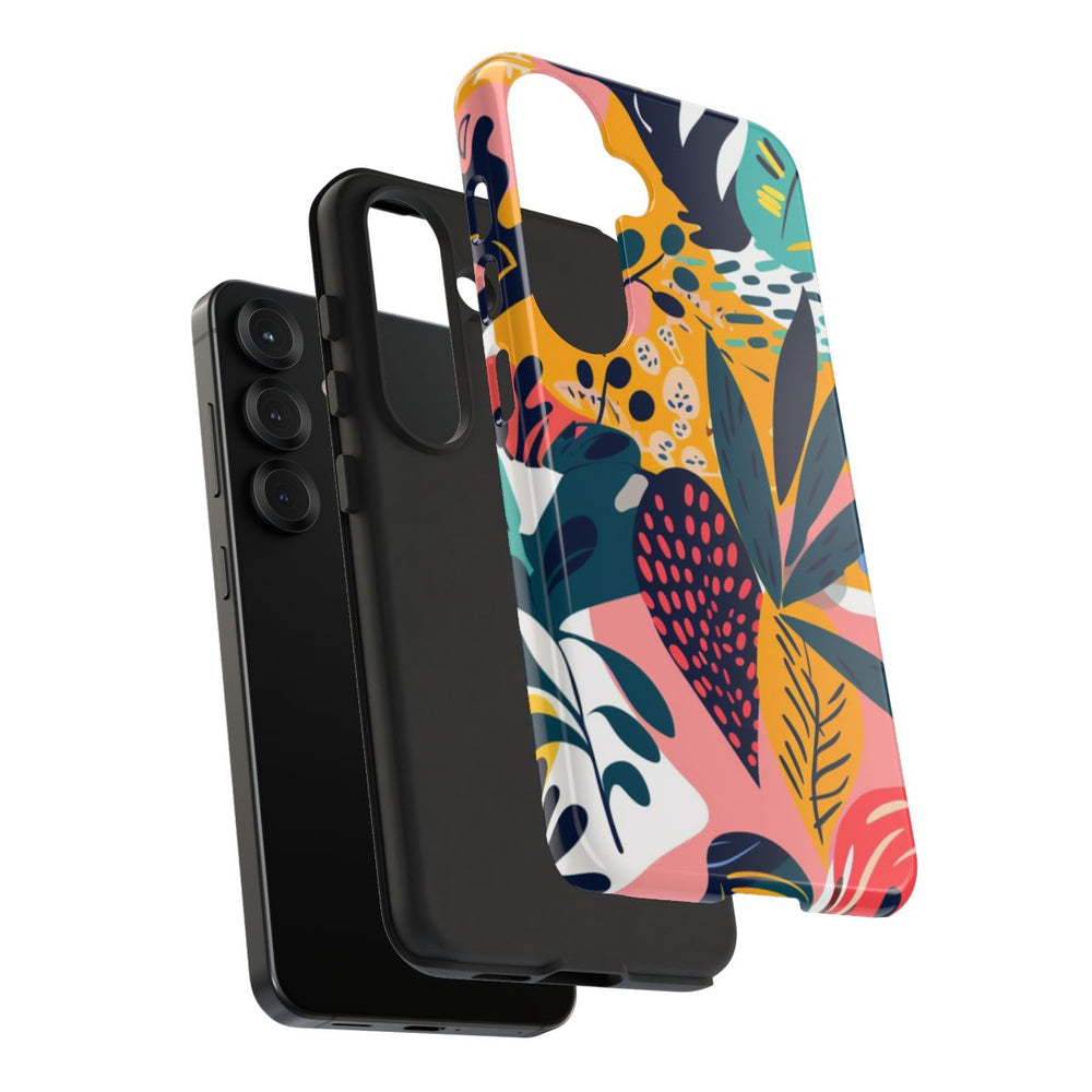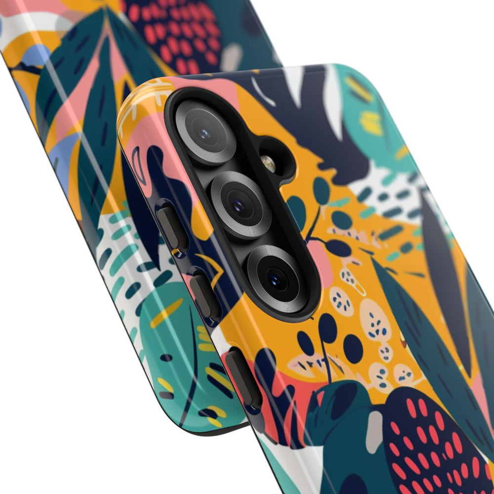 Dit telefoonhoesje is voorzien van een kleurrijk en levendig patroon met tropische bladeren in diverse vormen en maten. De bladeren zijn geïllustreerd in opvallende kleuren zoals donkerblauw, koraal, teal, geel en roze, en liggen over een achtergrond met abstracte vormen. Het geheel zorgt voor een zomerse en energieke uitstraling. Het hoesje heeft een glanzende afwerking en bestaat uit twee lagen: een stevige polycarbonaat buitenkant en een TPU-binnenzijde voor extra stevigheid en bescherming. Het hoesje ondersteunt draadloos opladen en is uitstekend bestand tegen weersinvloeden, waardoor de heldere uitstraling langdurig behouden blijft.
