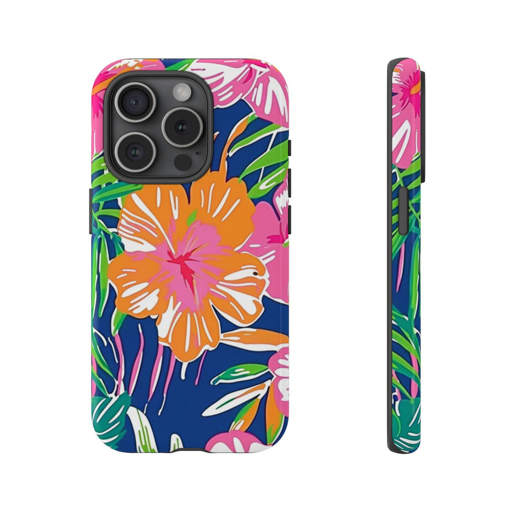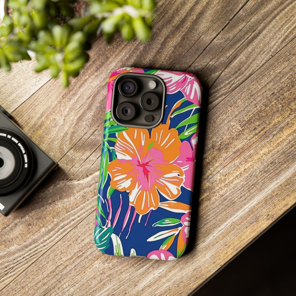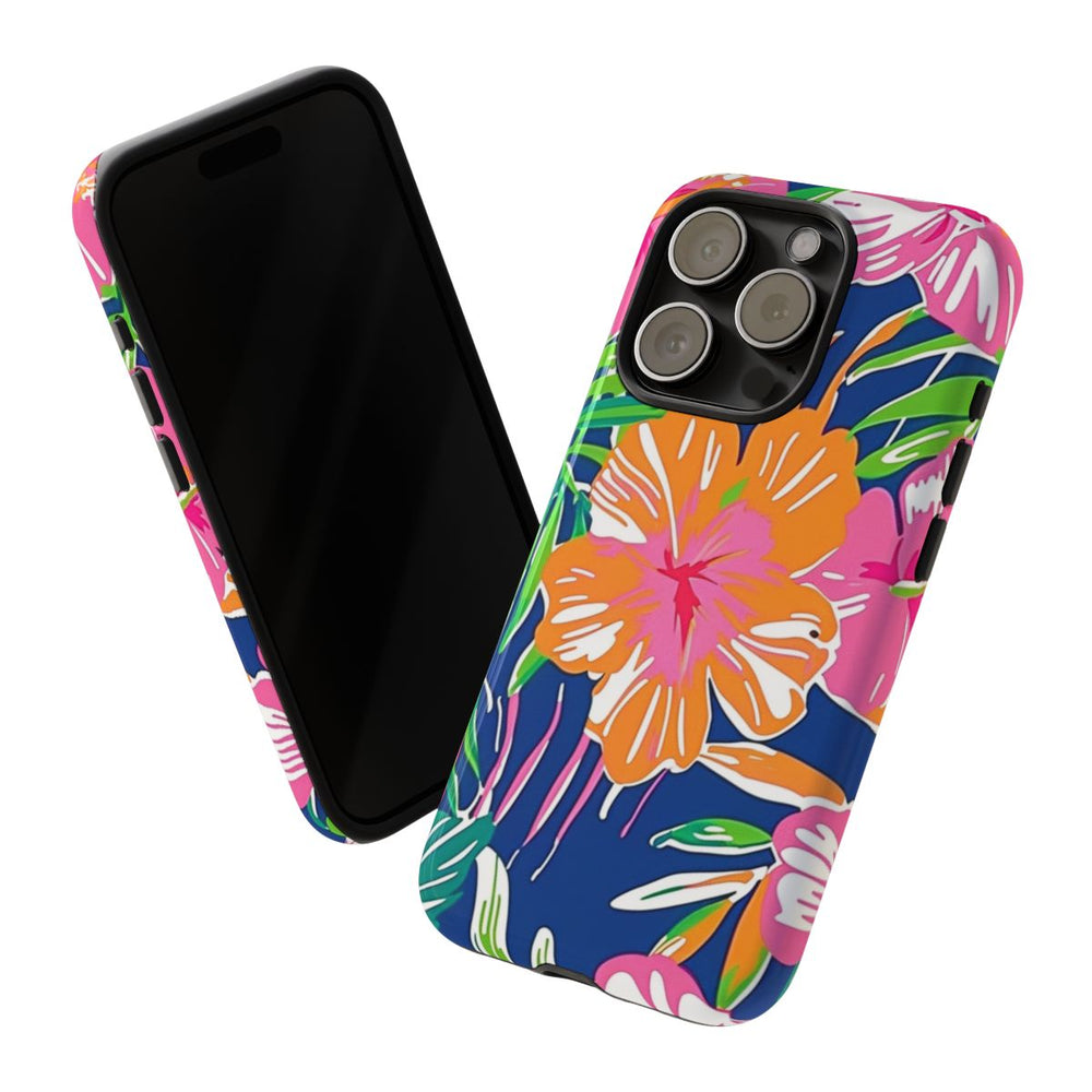 Dit hoesje is versierd met een opvallend tropisch bloemenpatroon met grote hibiscusbloemen in roze, oranje en koraaltinten. De bloemen worden omringd door weelderige groene palmbladeren en ander tropisch bladgroen, geplaatst op een diepblauwe achtergrond. De stijl is gedurfd en kleurrijk, met duidelijke vormen en een levendige, zomerse uitstraling. Het hoesje heeft een glanzende afwerking en bestaat uit een stevige polycarbonaat buitenkant en een TPU binnenzijde. Zo biedt het dubbele bescherming en is het geschikt voor draadloos opladen.