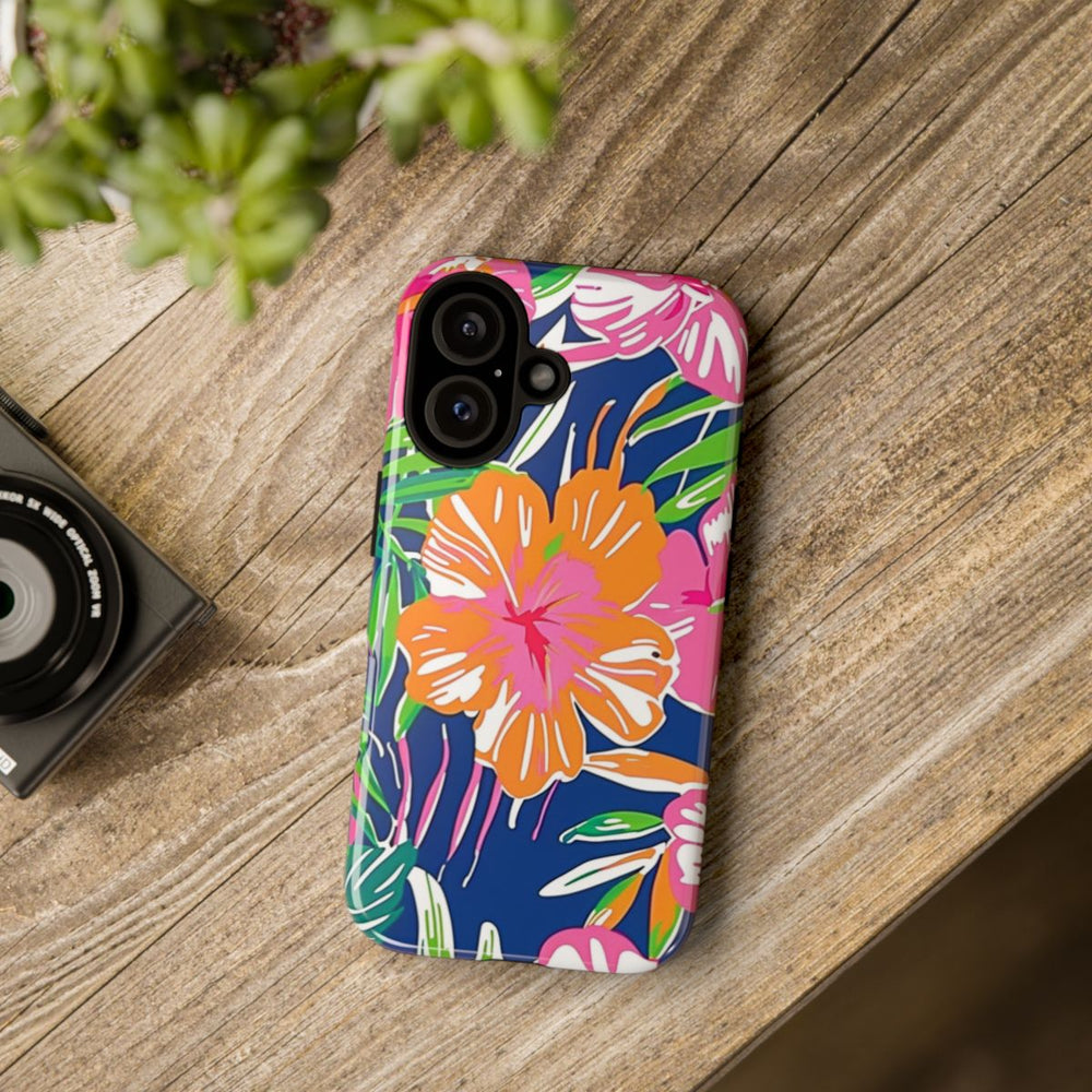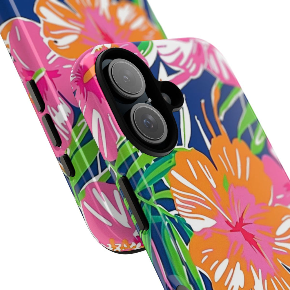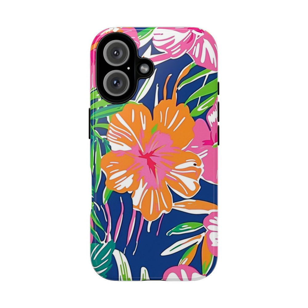 Dit hoesje is versierd met een opvallend tropisch bloemenpatroon met grote hibiscusbloemen in roze, oranje en koraaltinten. De bloemen worden omringd door weelderige groene palmbladeren en ander tropisch bladgroen, geplaatst op een diepblauwe achtergrond. De stijl is gedurfd en kleurrijk, met duidelijke vormen en een levendige, zomerse uitstraling. Het hoesje heeft een glanzende afwerking en bestaat uit een stevige polycarbonaat buitenkant en een TPU binnenzijde. Zo biedt het dubbele bescherming en is het geschikt voor draadloos opladen.