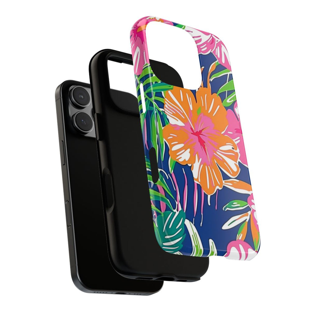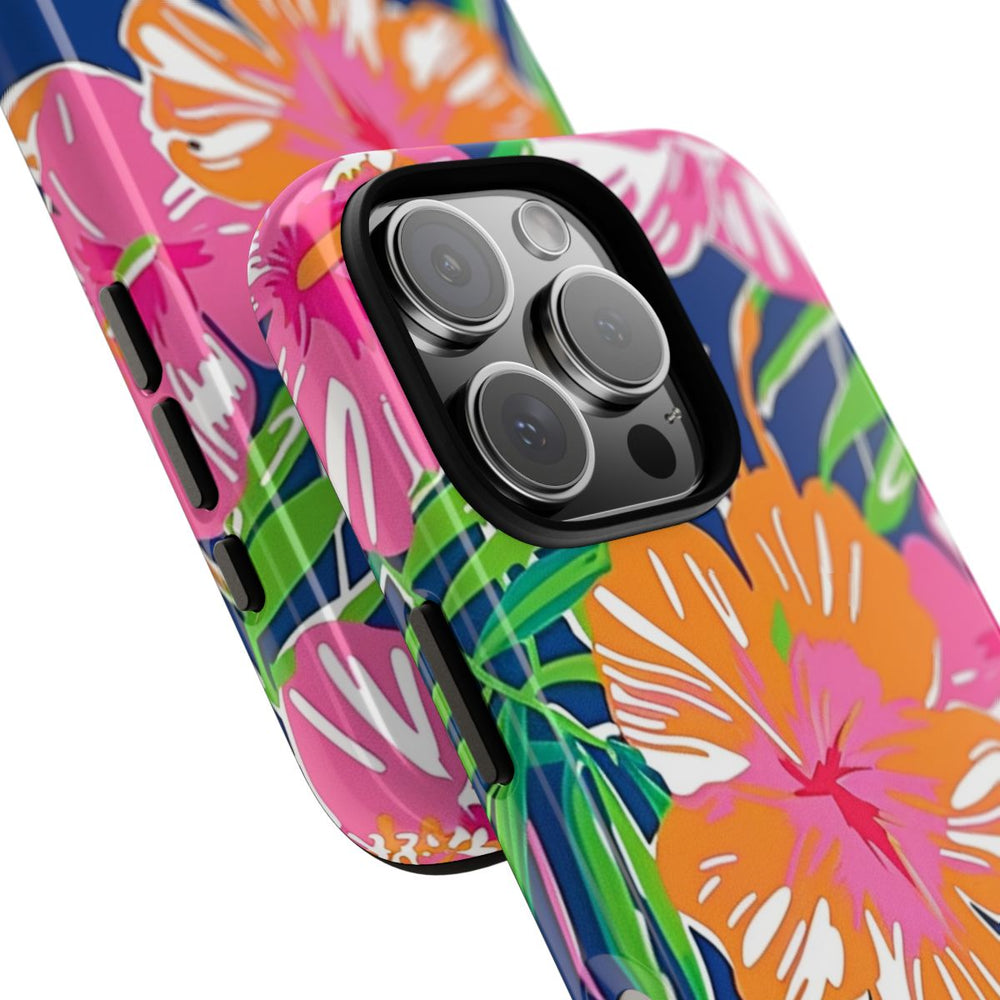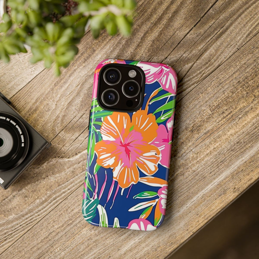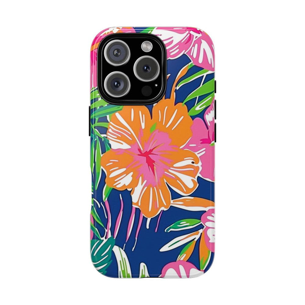 Dit hoesje is versierd met een opvallend tropisch bloemenpatroon met grote hibiscusbloemen in roze, oranje en koraaltinten. De bloemen worden omringd door weelderige groene palmbladeren en ander tropisch bladgroen, geplaatst op een diepblauwe achtergrond. De stijl is gedurfd en kleurrijk, met duidelijke vormen en een levendige, zomerse uitstraling. Het hoesje heeft een glanzende afwerking en bestaat uit een stevige polycarbonaat buitenkant en een TPU binnenzijde. Zo biedt het dubbele bescherming en is het geschikt voor draadloos opladen.