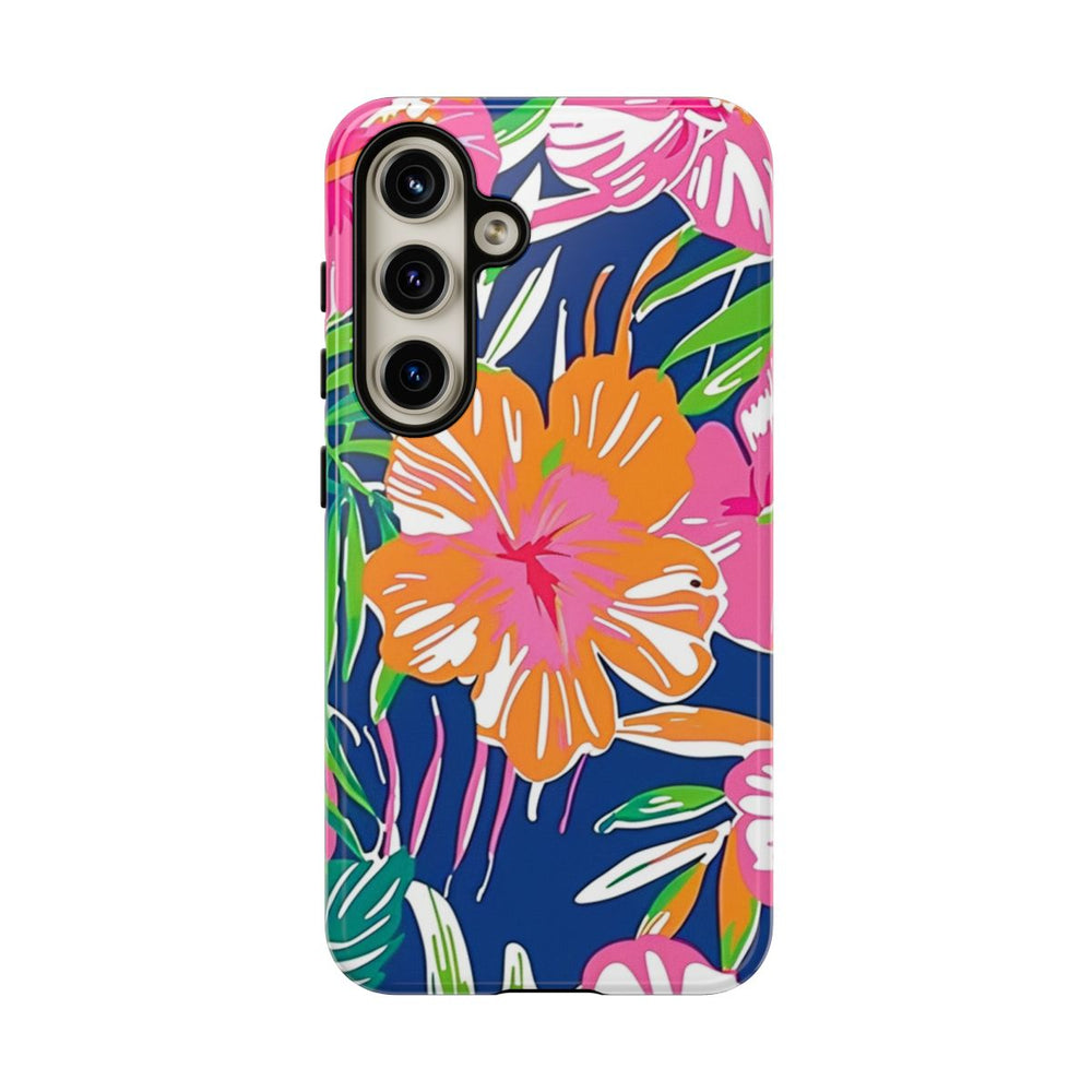 Dit hoesje is versierd met een opvallend tropisch bloemenpatroon met grote hibiscusbloemen in roze, oranje en koraaltinten. De bloemen worden omringd door weelderige groene palmbladeren en ander tropisch bladgroen, geplaatst op een diepblauwe achtergrond. De stijl is gedurfd en kleurrijk, met duidelijke vormen en een levendige, zomerse uitstraling. Het hoesje heeft een glanzende afwerking en bestaat uit een stevige polycarbonaat buitenkant en een TPU binnenzijde. Zo biedt het dubbele bescherming en is het geschikt voor draadloos opladen.