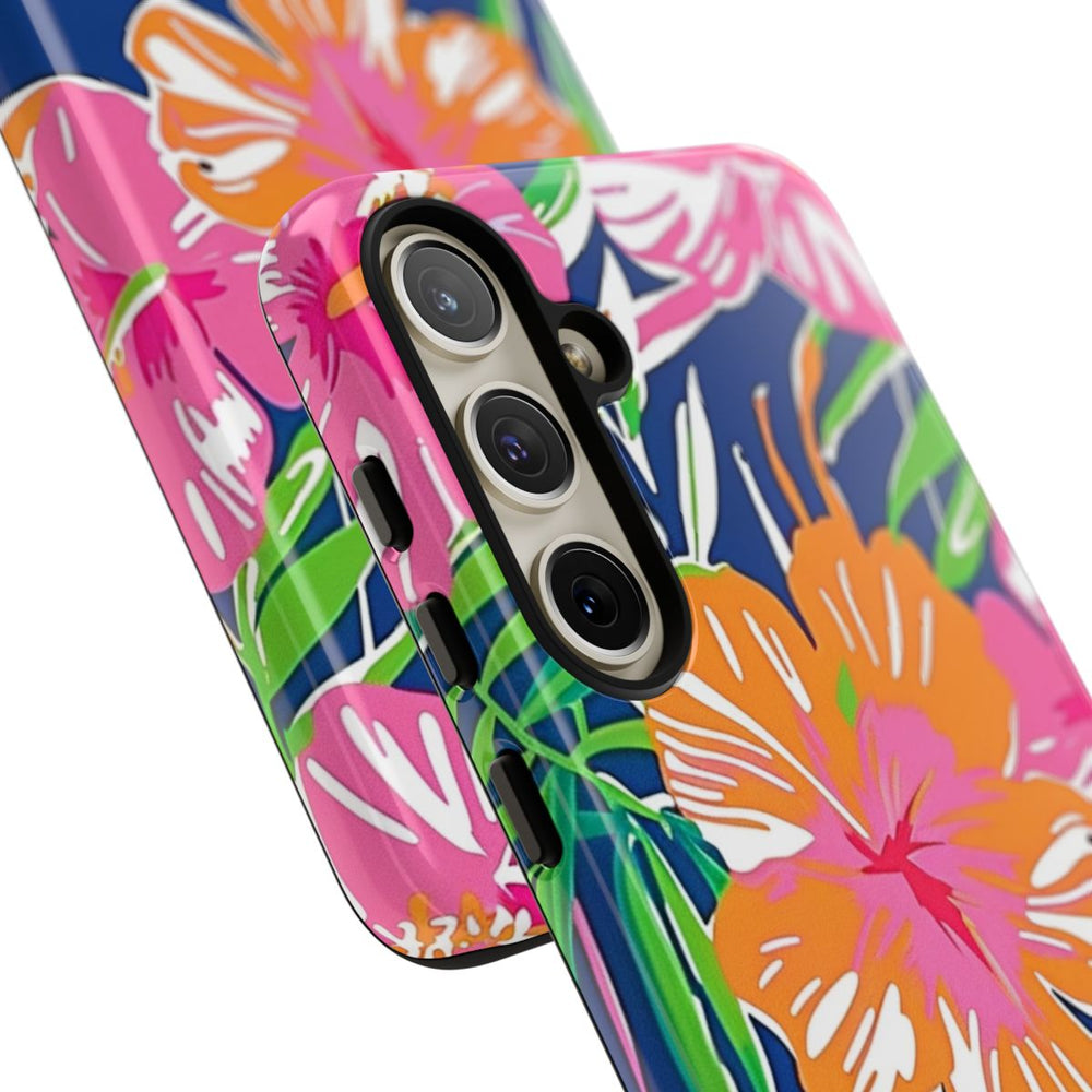 Dit hoesje is versierd met een opvallend tropisch bloemenpatroon met grote hibiscusbloemen in roze, oranje en koraaltinten. De bloemen worden omringd door weelderige groene palmbladeren en ander tropisch bladgroen, geplaatst op een diepblauwe achtergrond. De stijl is gedurfd en kleurrijk, met duidelijke vormen en een levendige, zomerse uitstraling. Het hoesje heeft een glanzende afwerking en bestaat uit een stevige polycarbonaat buitenkant en een TPU binnenzijde. Zo biedt het dubbele bescherming en is het geschikt voor draadloos opladen.