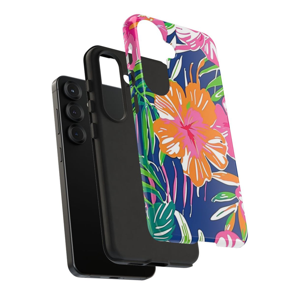 Dit hoesje is versierd met een opvallend tropisch bloemenpatroon met grote hibiscusbloemen in roze, oranje en koraaltinten. De bloemen worden omringd door weelderige groene palmbladeren en ander tropisch bladgroen, geplaatst op een diepblauwe achtergrond. De stijl is gedurfd en kleurrijk, met duidelijke vormen en een levendige, zomerse uitstraling. Het hoesje heeft een glanzende afwerking en bestaat uit een stevige polycarbonaat buitenkant en een TPU binnenzijde. Zo biedt het dubbele bescherming en is het geschikt voor draadloos opladen.