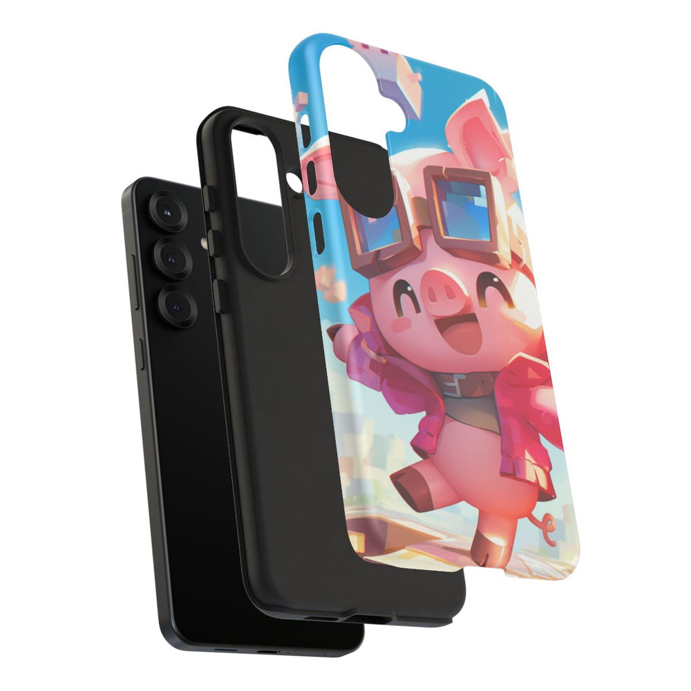 Dit hoesje toont een vrolijk roze varkentje met een felroze hoodie en grote vierkante bril met blauwe glazen. Het varkentje staat op één been en steekt blij de armen in de lucht. De achtergrond bestaat uit een gestileerde 3D-omgeving met zwevende blokvormen en een heldere blauwe lucht met wolken. Het hoesje heeft een stevige polycarbonaat buitenkant en een TPU-binnenzijde, waardoor het duurzaam is en geschikt voor draadloos opladen.