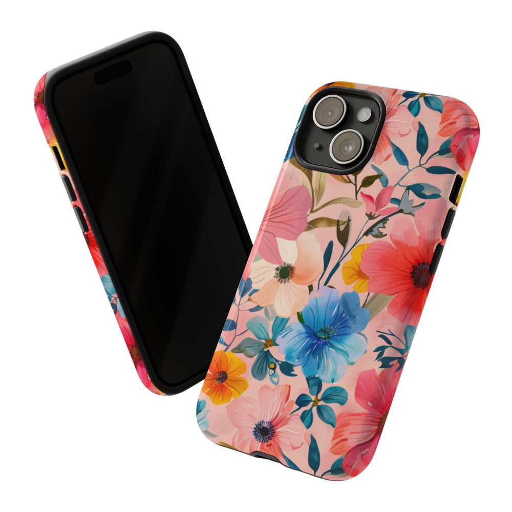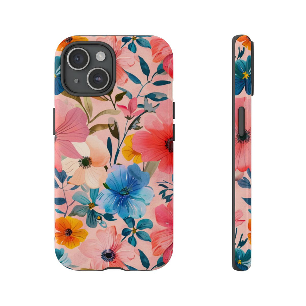 Dit hoesje heeft een kleurrijk bloemenpatroon met verschillende bloemen in tinten roze, blauw, geel en koraal. De bloemen zijn gedetailleerd weergegeven met zichtbare bloemblaadjes en hartjes, omringd door groene en teal bladeren en stelen. De zachte perzikroze achtergrond laat de heldere en vrolijke bloemen extra opvallen. Het hoesje is glanzend en stevig, en bestaat uit een dubbele laag met een polycarbonaat buitenkant en een TPU binnenzijde. Dit zorgt voor extra stevigheid en bescherming, terwijl draadloos opladen mogelijk blijft.