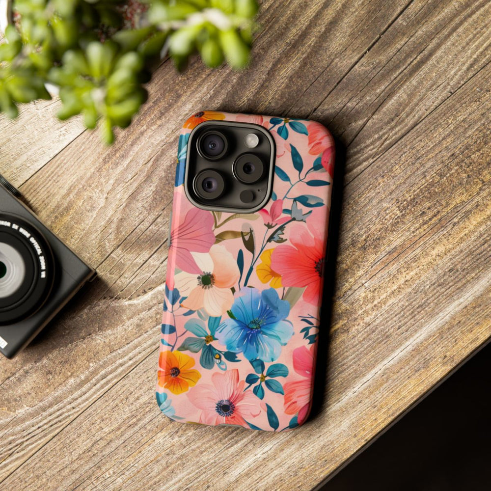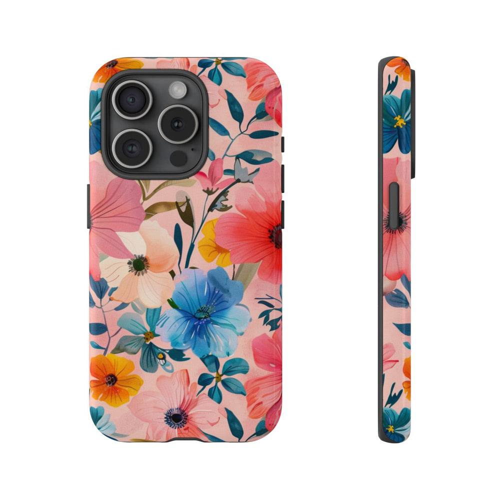 Dit hoesje heeft een kleurrijk bloemenpatroon met verschillende bloemen in tinten roze, blauw, geel en koraal. De bloemen zijn gedetailleerd weergegeven met zichtbare bloemblaadjes en hartjes, omringd door groene en teal bladeren en stelen. De zachte perzikroze achtergrond laat de heldere en vrolijke bloemen extra opvallen. Het hoesje is glanzend en stevig, en bestaat uit een dubbele laag met een polycarbonaat buitenkant en een TPU binnenzijde. Dit zorgt voor extra stevigheid en bescherming, terwijl draadloos opladen mogelijk blijft.
