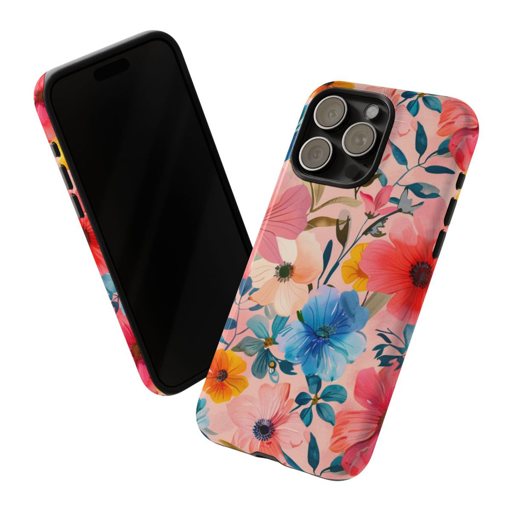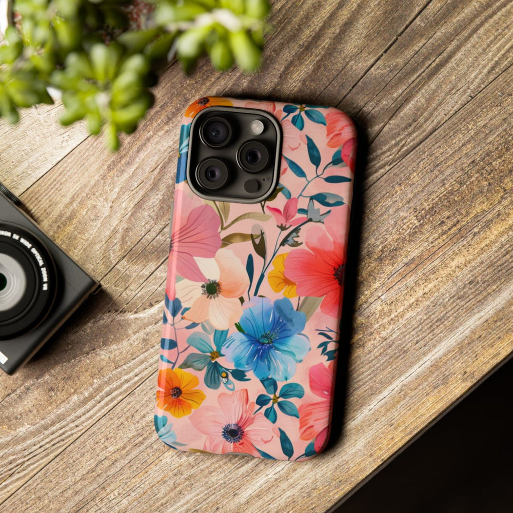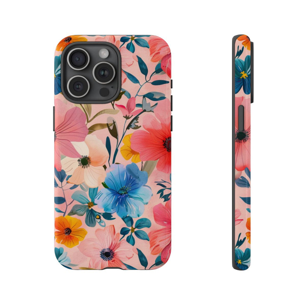Dit hoesje heeft een kleurrijk bloemenpatroon met verschillende bloemen in tinten roze, blauw, geel en koraal. De bloemen zijn gedetailleerd weergegeven met zichtbare bloemblaadjes en hartjes, omringd door groene en teal bladeren en stelen. De zachte perzikroze achtergrond laat de heldere en vrolijke bloemen extra opvallen. Het hoesje is glanzend en stevig, en bestaat uit een dubbele laag met een polycarbonaat buitenkant en een TPU binnenzijde. Dit zorgt voor extra stevigheid en bescherming, terwijl draadloos opladen mogelijk blijft.