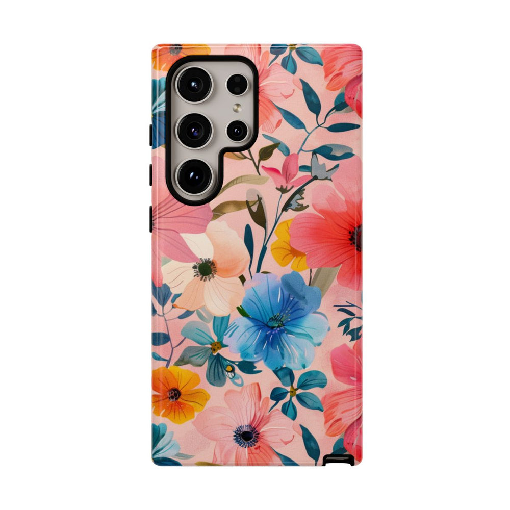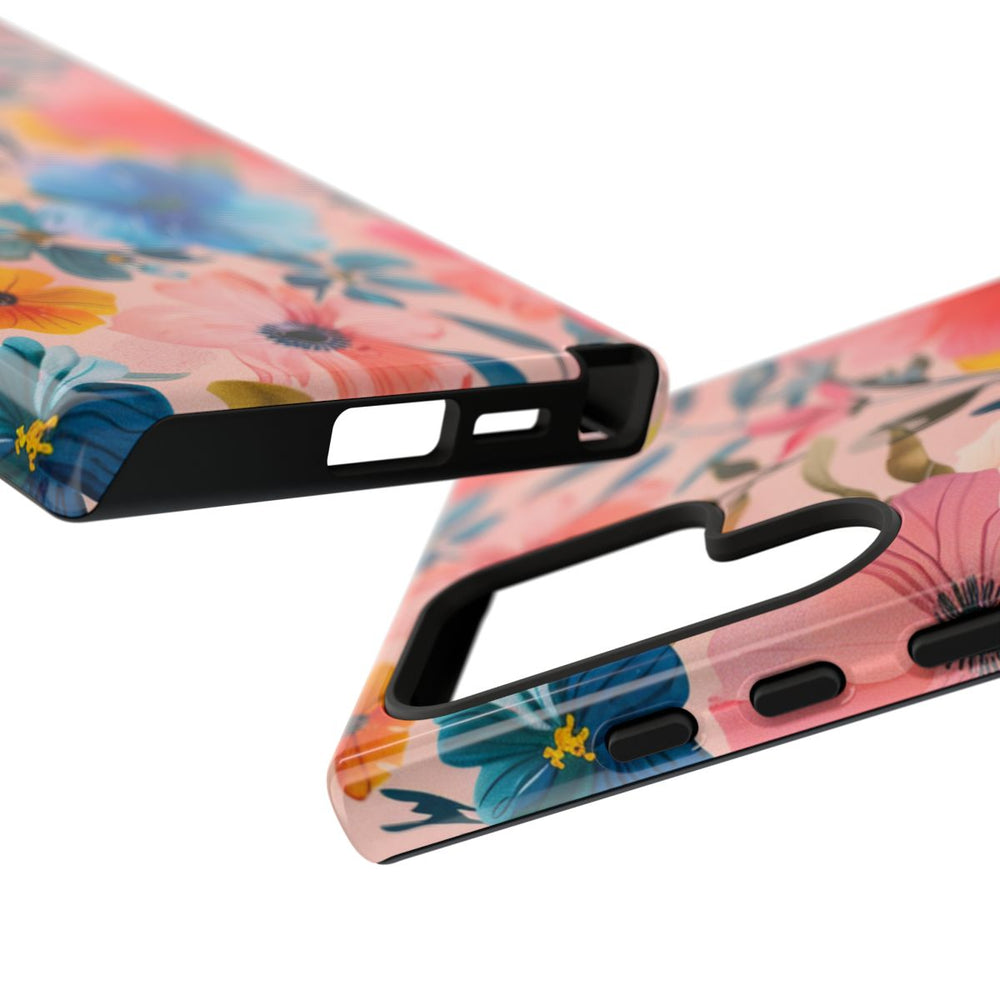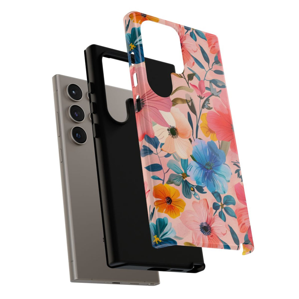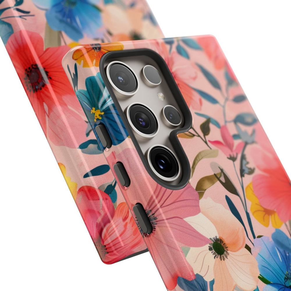 Dit hoesje heeft een kleurrijk bloemenpatroon met verschillende bloemen in tinten roze, blauw, geel en koraal. De bloemen zijn gedetailleerd weergegeven met zichtbare bloemblaadjes en hartjes, omringd door groene en teal bladeren en stelen. De zachte perzikroze achtergrond laat de heldere en vrolijke bloemen extra opvallen. Het hoesje is glanzend en stevig, en bestaat uit een dubbele laag met een polycarbonaat buitenkant en een TPU binnenzijde. Dit zorgt voor extra stevigheid en bescherming, terwijl draadloos opladen mogelijk blijft.