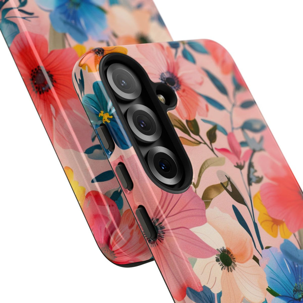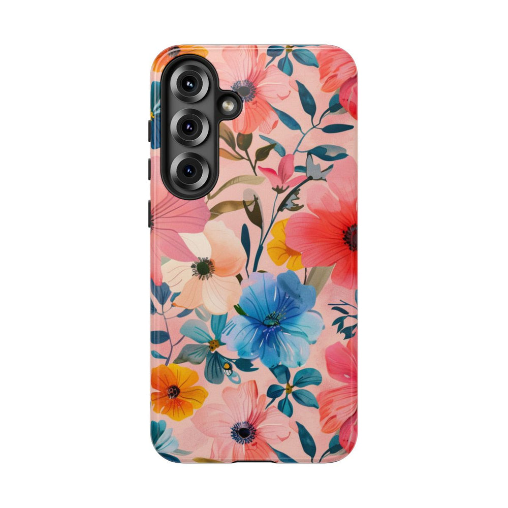 Dit hoesje heeft een kleurrijk bloemenpatroon met verschillende bloemen in tinten roze, blauw, geel en koraal. De bloemen zijn gedetailleerd weergegeven met zichtbare bloemblaadjes en hartjes, omringd door groene en teal bladeren en stelen. De zachte perzikroze achtergrond laat de heldere en vrolijke bloemen extra opvallen. Het hoesje is glanzend en stevig, en bestaat uit een dubbele laag met een polycarbonaat buitenkant en een TPU binnenzijde. Dit zorgt voor extra stevigheid en bescherming, terwijl draadloos opladen mogelijk blijft.