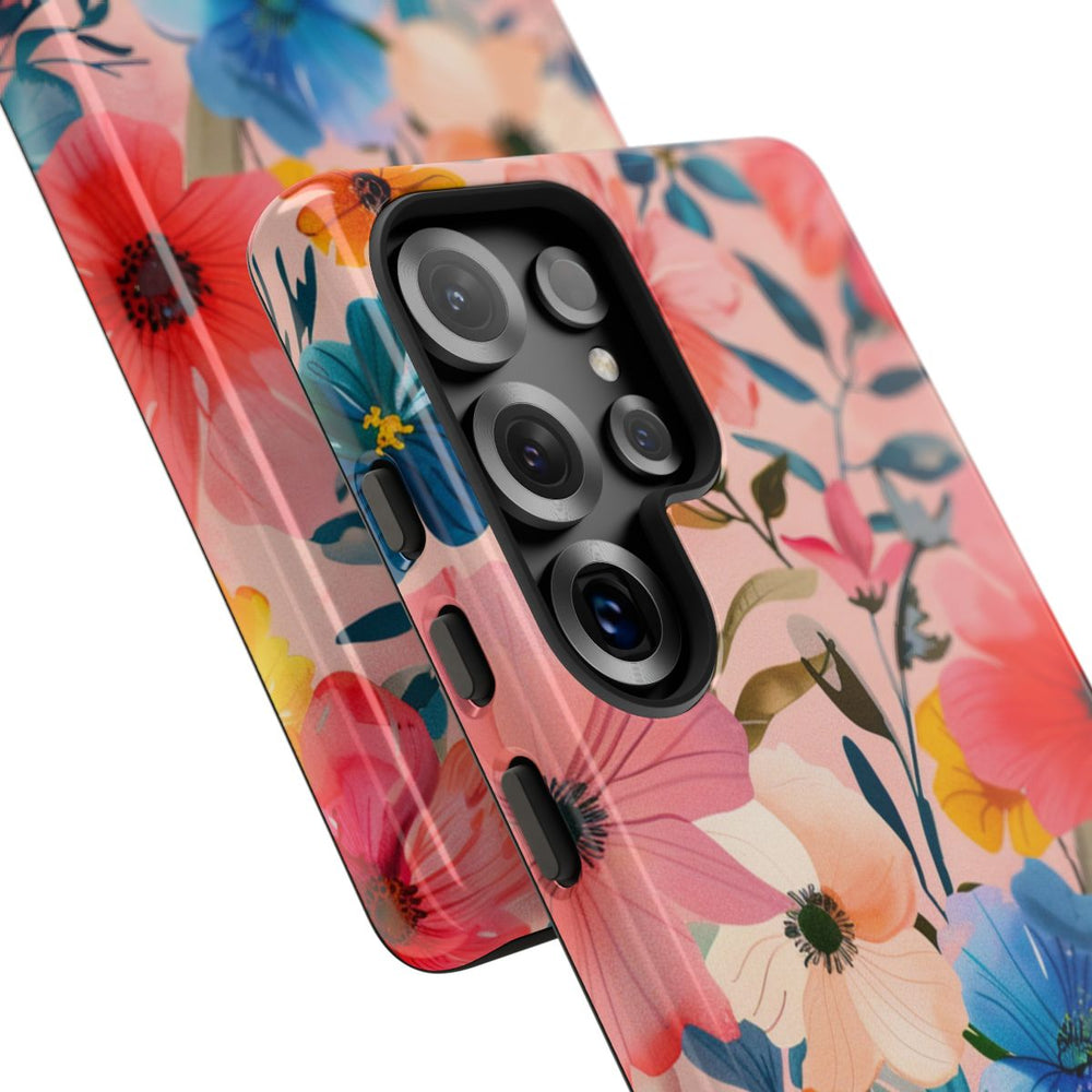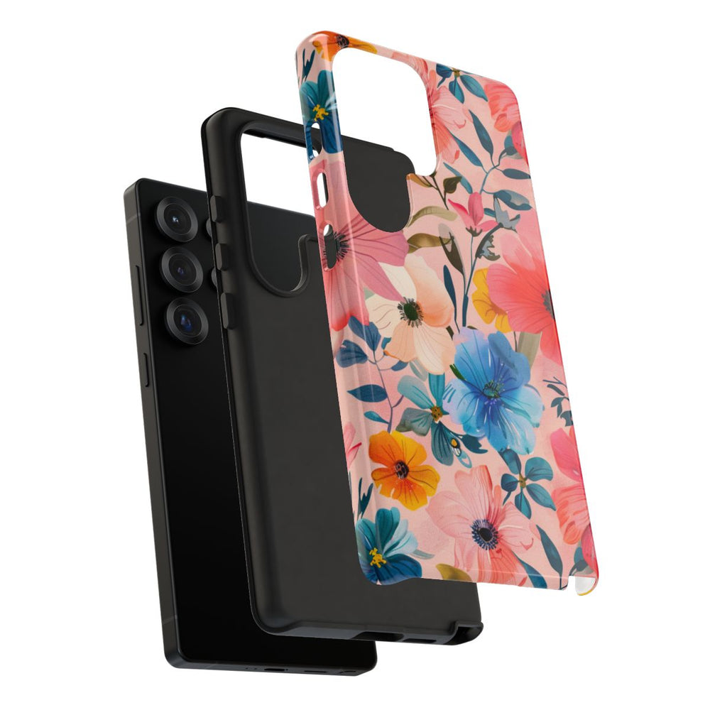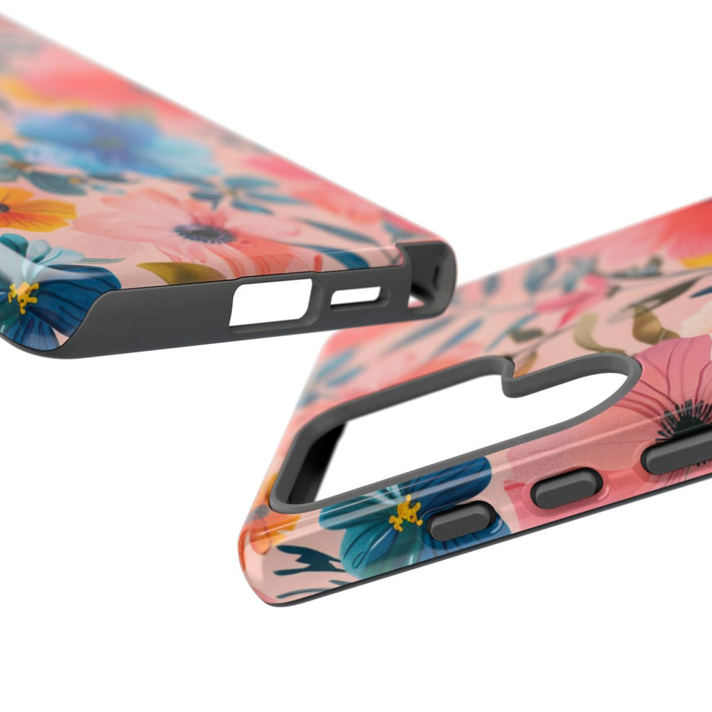 Dit hoesje heeft een kleurrijk bloemenpatroon met verschillende bloemen in tinten roze, blauw, geel en koraal. De bloemen zijn gedetailleerd weergegeven met zichtbare bloemblaadjes en hartjes, omringd door groene en teal bladeren en stelen. De zachte perzikroze achtergrond laat de heldere en vrolijke bloemen extra opvallen. Het hoesje is glanzend en stevig, en bestaat uit een dubbele laag met een polycarbonaat buitenkant en een TPU binnenzijde. Dit zorgt voor extra stevigheid en bescherming, terwijl draadloos opladen mogelijk blijft.