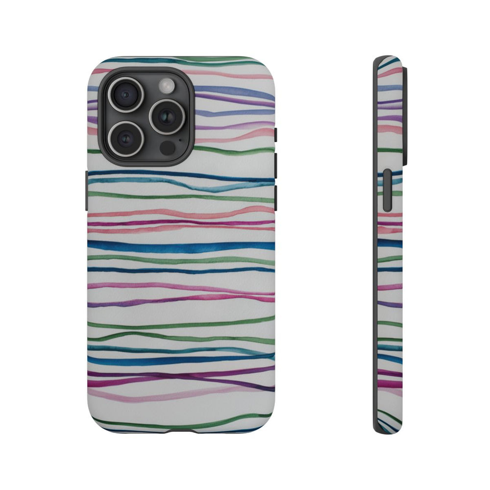 Dit hoesje heeft een speels ontwerp met meerdere horizontale strepen in waterverf in verschillende tinten blauw, groen, roze en paars op een witte achtergrond. De lijnen ogen handgeschilderd, zijn licht golvend en verschillen in dikte voor een unieke uitstraling. Het hoesje bestaat uit twee lagen: een stevige polycarbonaat buitenkant en een TPU-binnenkant voor extra stevigheid en bescherming. Ondersteunt draadloos opladen, maar is niet geschikt voor MagSafe.