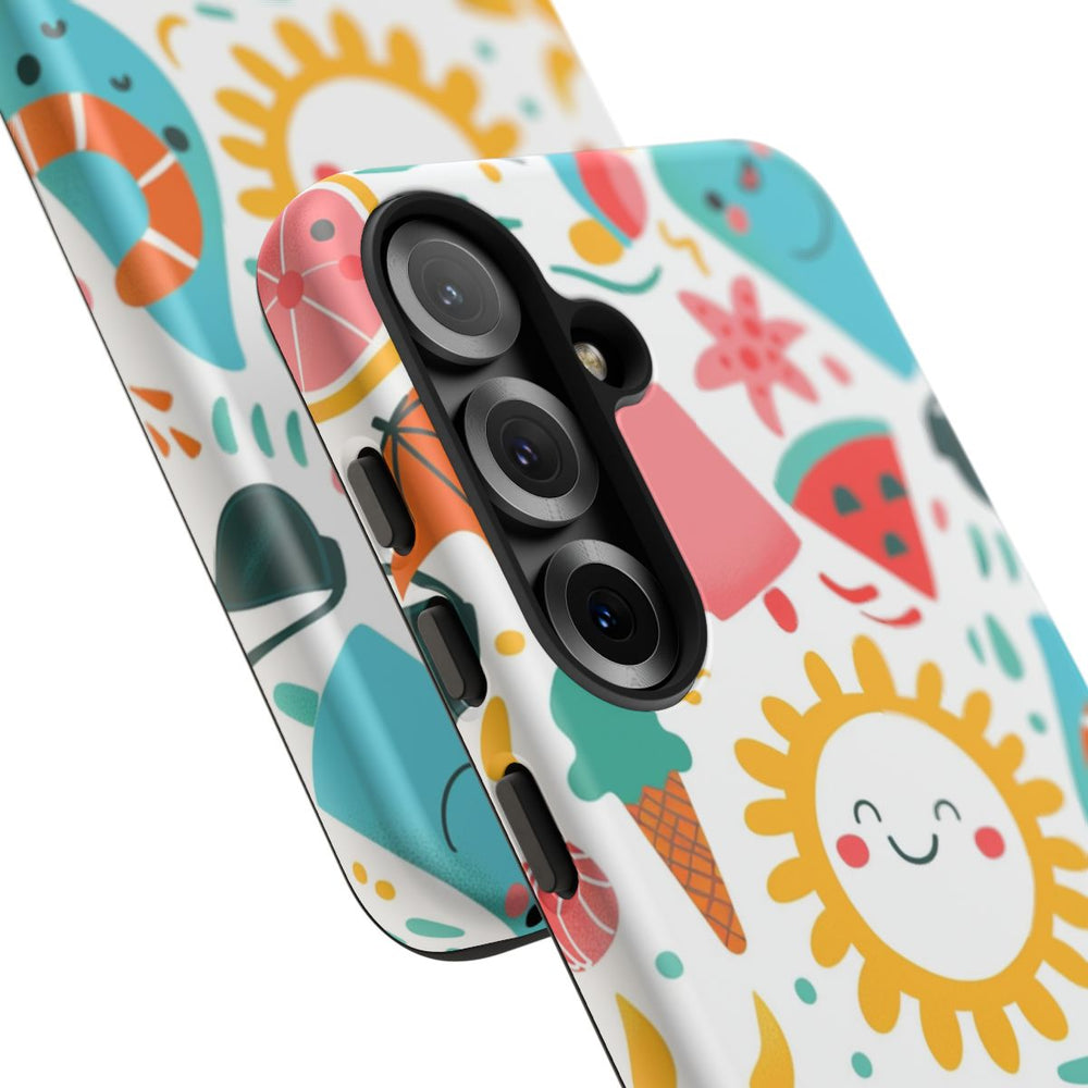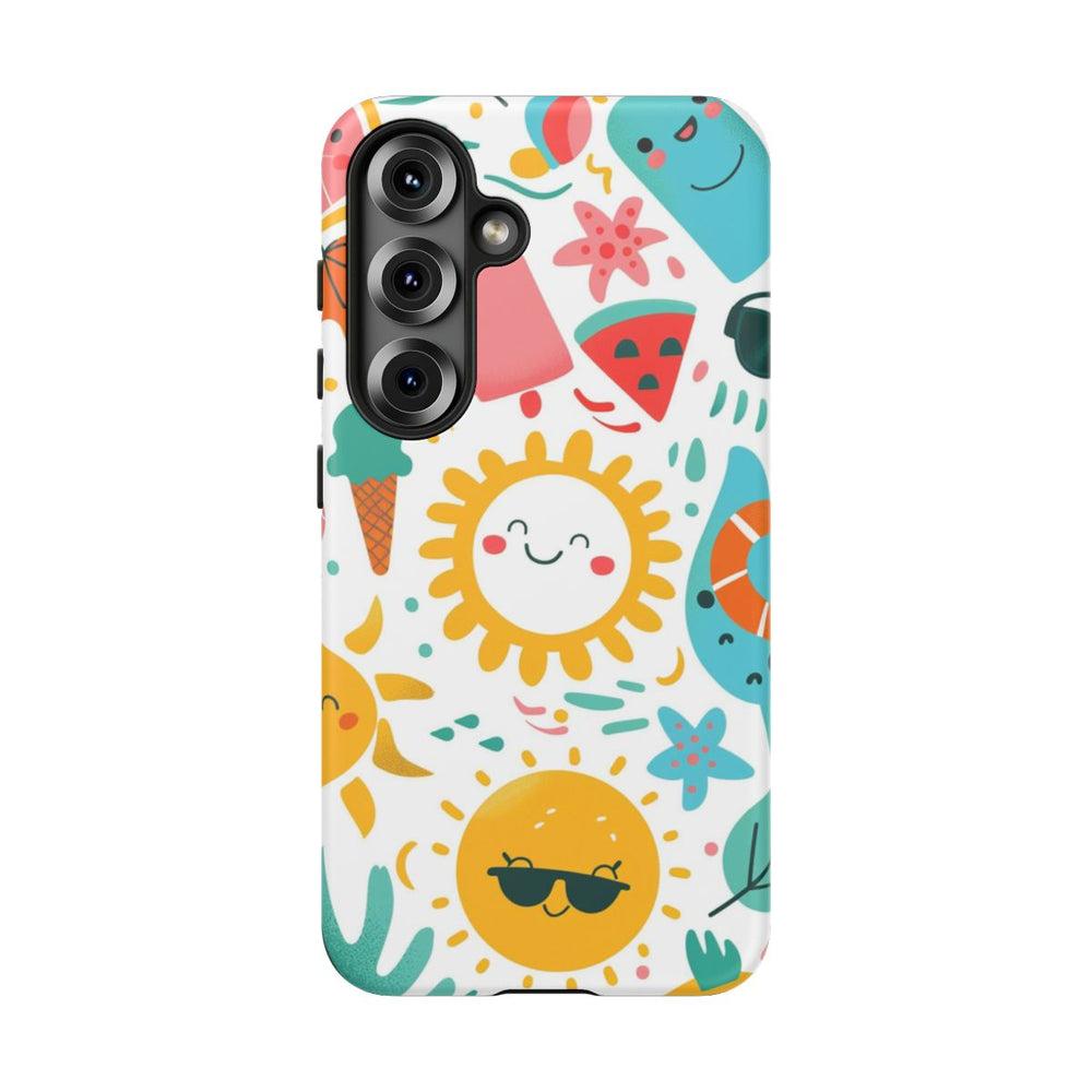 Dit hoesje is voorzien van een vrolijk zomerpatroon met lachende zonnetjes, kleurrijke ijsjes, hoorntjes, watermeloenpartjes, tropische bladeren, zonnebrillen en schattige zeedieren. De elementen zijn speels en cartoonachtig vormgegeven en staan op een witte achtergrond met heldere kleuren zoals geel, teal, roze, oranje en lichtblauw. Het stevige hoesje heeft een dubbele laag van polycarbonaat en TPU en is geschikt voor draadloos opladen.