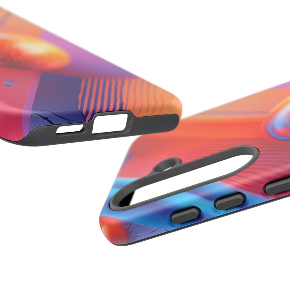 Dit hoesje heeft een opvallend abstract ontwerp met grote en kleine bollen in paarse, oranje en rode tinten. De achtergrond bestaat uit getextureerde strepen en lijnpatronen in heldere oranje, blauwe en paarse kleuren. Het geheel oogt modern en dynamisch dankzij vloeiende kleurverlopen en glanzende reflecties op de bollen. Het hoesje bestaat uit twee lagen van polycarbonaat en TPU, heeft een matte afwerking en ondersteunt draadloos opladen.