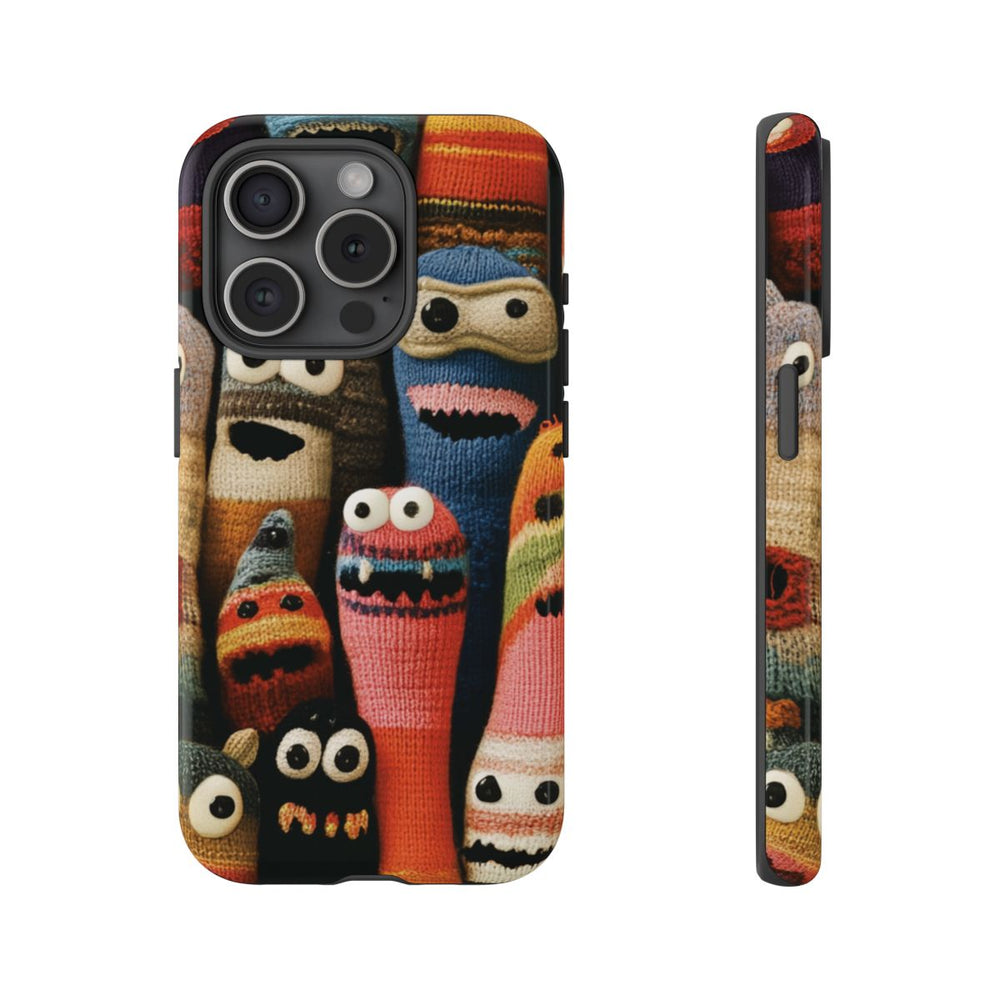 Dit hoesje heeft een kleurrijk ontwerp met grappige gebreide monsters die dicht bij elkaar staan. Elk monstertje heeft een eigen gezichtsuitdrukking met grote ogen en verschillende mondjes, waarvan sommige tanden laten zien. De monsters zijn gemaakt van veelkleurig garen met strepen, patronen en uiteenlopende texturen. Het geheel oogt speels en levendig, met een mix van warme en koele kleuren. Het hoesje is glanzend, stevig en bestaat uit twee lagen voor extra bescherming. Geschikt voor draadloos opladen.