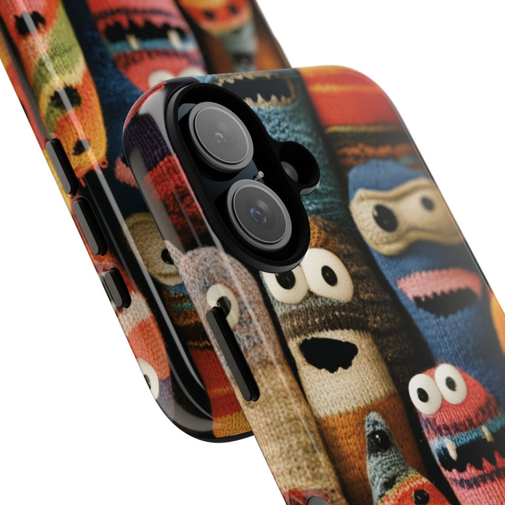 Dit hoesje heeft een kleurrijk ontwerp met grappige gebreide monsters die dicht bij elkaar staan. Elk monstertje heeft een eigen gezichtsuitdrukking met grote ogen en verschillende mondjes, waarvan sommige tanden laten zien. De monsters zijn gemaakt van veelkleurig garen met strepen, patronen en uiteenlopende texturen. Het geheel oogt speels en levendig, met een mix van warme en koele kleuren. Het hoesje is glanzend, stevig en bestaat uit twee lagen voor extra bescherming. Geschikt voor draadloos opladen.