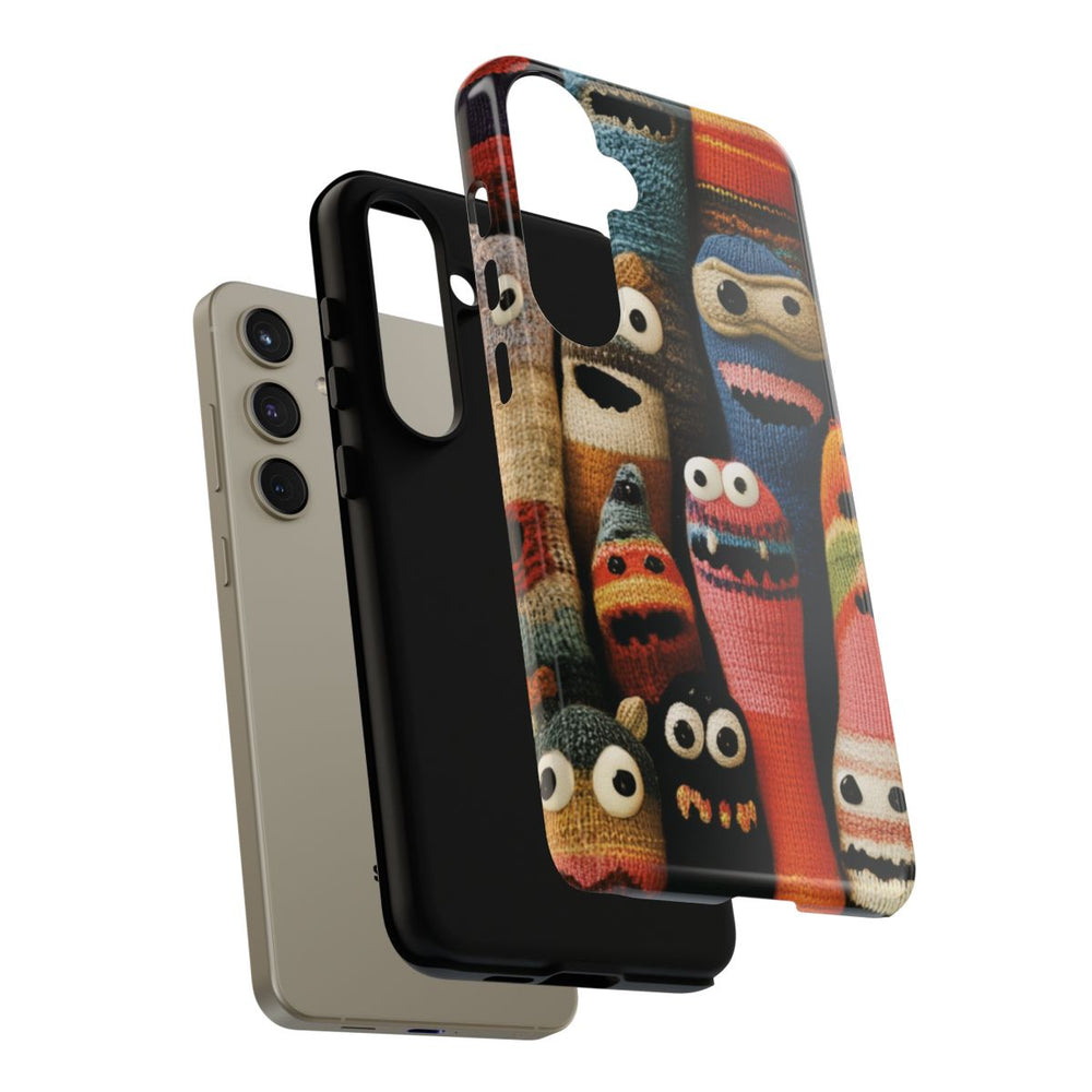 Dit hoesje heeft een kleurrijk ontwerp met grappige gebreide monsters die dicht bij elkaar staan. Elk monstertje heeft een eigen gezichtsuitdrukking met grote ogen en verschillende mondjes, waarvan sommige tanden laten zien. De monsters zijn gemaakt van veelkleurig garen met strepen, patronen en uiteenlopende texturen. Het geheel oogt speels en levendig, met een mix van warme en koele kleuren. Het hoesje is glanzend, stevig en bestaat uit twee lagen voor extra bescherming. Geschikt voor draadloos opladen.