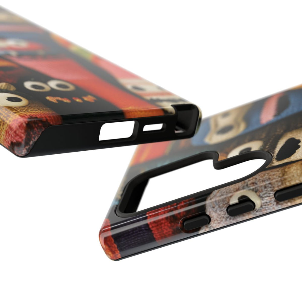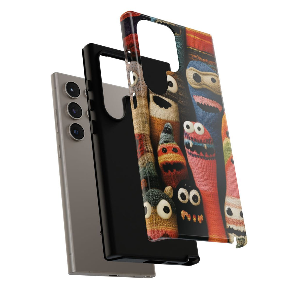 Dit hoesje heeft een kleurrijk ontwerp met grappige gebreide monsters die dicht bij elkaar staan. Elk monstertje heeft een eigen gezichtsuitdrukking met grote ogen en verschillende mondjes, waarvan sommige tanden laten zien. De monsters zijn gemaakt van veelkleurig garen met strepen, patronen en uiteenlopende texturen. Het geheel oogt speels en levendig, met een mix van warme en koele kleuren. Het hoesje is glanzend, stevig en bestaat uit twee lagen voor extra bescherming. Geschikt voor draadloos opladen.