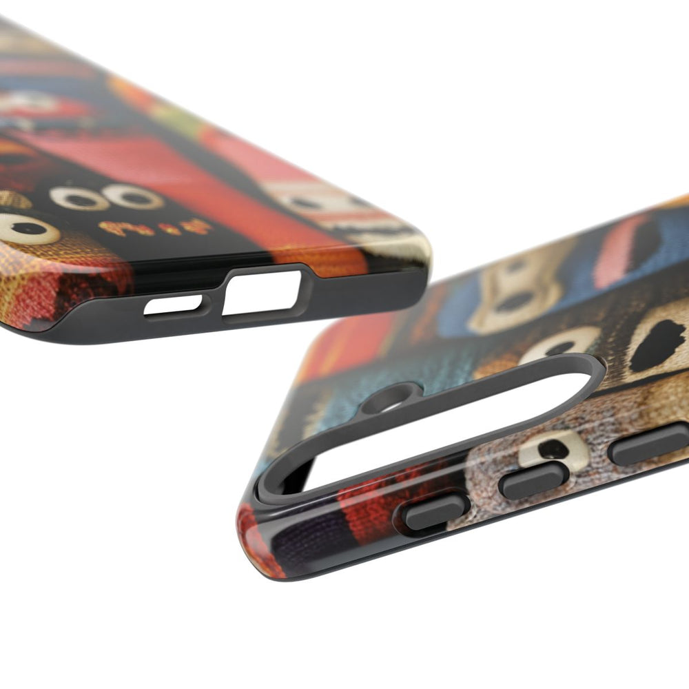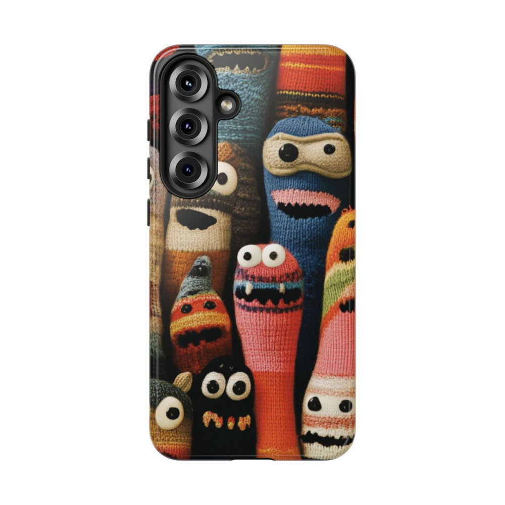 Dit hoesje heeft een kleurrijk ontwerp met grappige gebreide monsters die dicht bij elkaar staan. Elk monstertje heeft een eigen gezichtsuitdrukking met grote ogen en verschillende mondjes, waarvan sommige tanden laten zien. De monsters zijn gemaakt van veelkleurig garen met strepen, patronen en uiteenlopende texturen. Het geheel oogt speels en levendig, met een mix van warme en koele kleuren. Het hoesje is glanzend, stevig en bestaat uit twee lagen voor extra bescherming. Geschikt voor draadloos opladen.