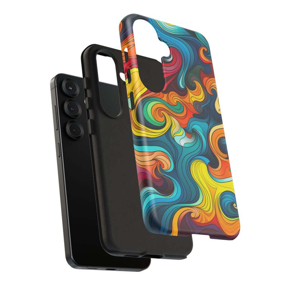 Dit telefoonhoesje heeft een opvallend en kleurrijk ontwerp met draaiende patronen in felle kleuren zoals rood, oranje, geel, blauw en groen. Het zorgt voor een levendige en speelse uitstraling. Dankzij de dubbele laag biedt het hoesje extra stevigheid en bescherming. Bovendien is het geschikt voor draadloos opladen, wat het hoesje praktisch maakt voor dagelijks gebruik.
