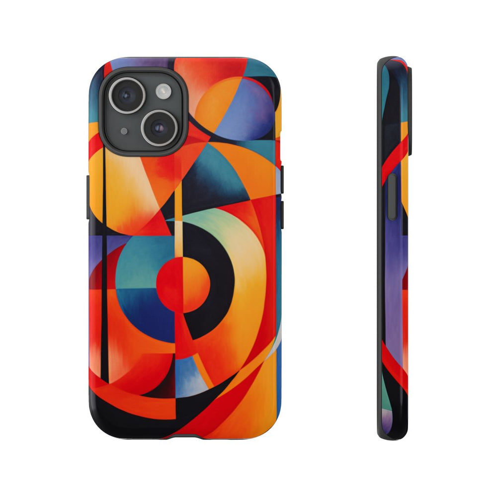 Dit ontwerp toont een levendige geometrische compositie met diverse vormen zoals cirkels, driehoeken en rechthoeken. Het kunstwerk gebruikt een rijk kleurenpalet met warme tinten rood, oranje en geel, afgewisseld met koele blauwen, paarstinten en teal. Scherpe lijnen en overlappende vormen zorgen voor een dynamisch en boeiend visueel effect. De afbeelding is gedrukt op een glanzend, stevig hoesje van duurzaam polycarbonaat en TPU, dat extra bescherming biedt en geschikt is voor draadloos opladen.