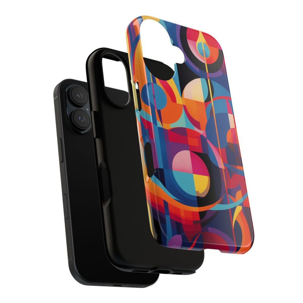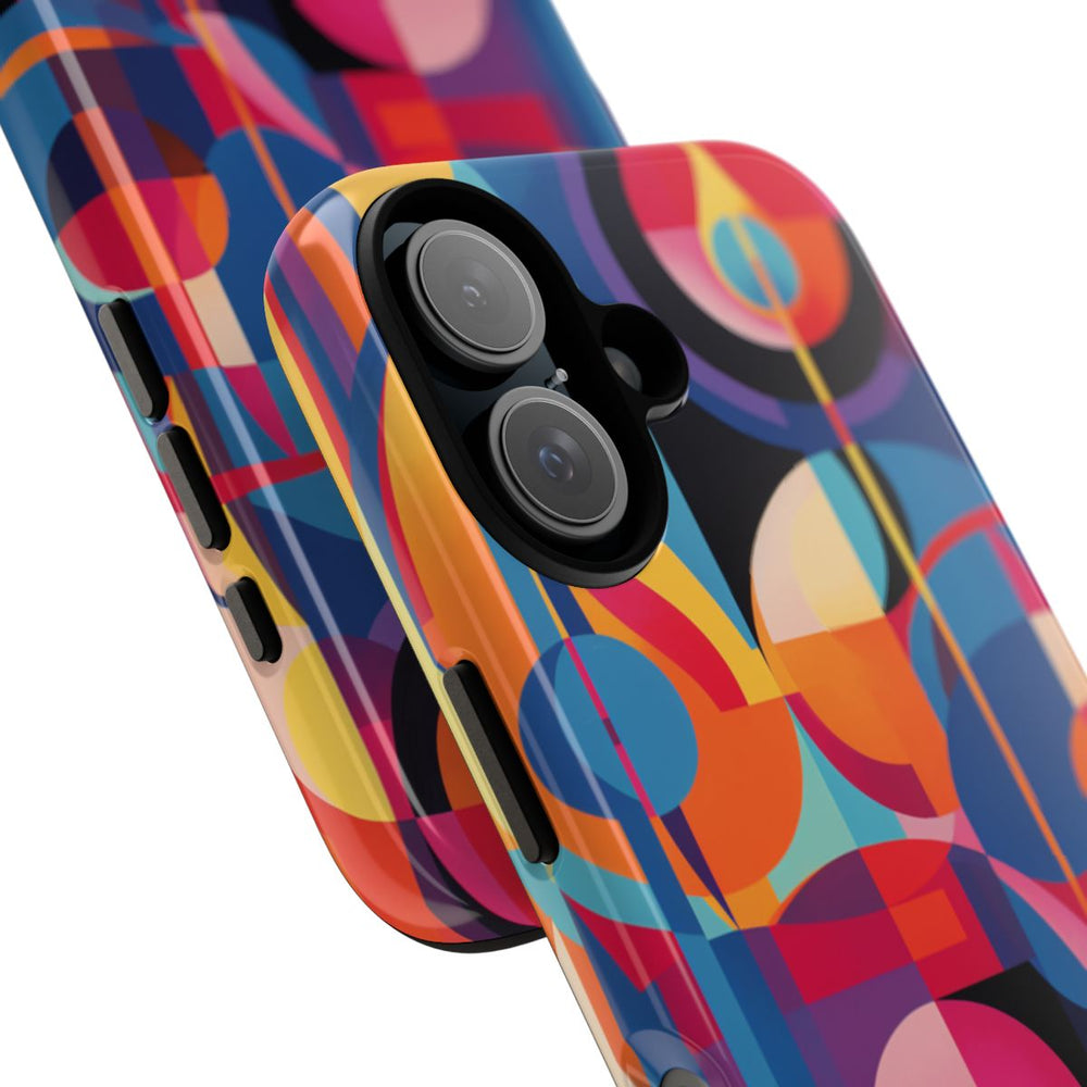 Dit telefoonhoesje heeft een opvallend geometrisch abstract ontwerp met overlappende vormen zoals cirkels, bogen en rechthoeken. De afbeelding bestaat uit een rijk palet van warme en koele kleuren, waaronder rood, oranje, geel, blauw en paars. De vormen zijn gelaagd met scherpe randen en vloeiende lijnen, wat zorgt voor een dynamische en moderne uitstraling. Het hoesje heeft een glanzende afwerking en is extra stevig dankzij de dubbele laag, waardoor je telefoon optimaal beschermd is. Geschikt voor draadloos opladen en bestand tegen verschillende weersomstandigheden.