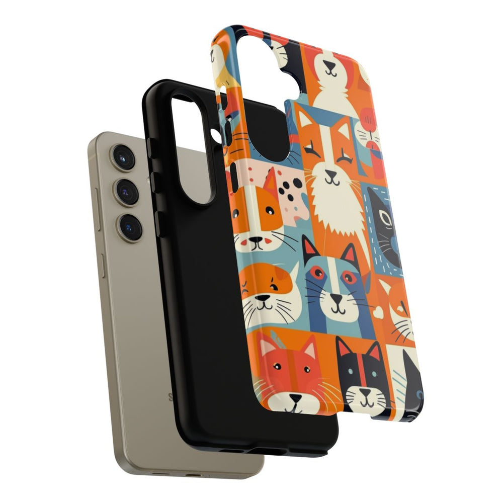 Dit telefoonhoesje is voorzien van een speels patroon met verschillende gestileerde kattenkopjes in een grafische stijl. De katten zijn afgebeeld in uiteenlopende kleuren zoals oranje, blauw, zwart, wit en crème, en zijn gerangschikt in een raster waarbij elk gezichtje zijn eigen vakje heeft. De kleurstelling is levendig, met vooral veel oranje en blauwe tinten. Het hoesje heeft een glanzende afwerking en is extra stevig dankzij de dubbele laag van polycarbonaat en TPU. Dit zorgt voor optimale bescherming en maakt draadloos opladen mogelijk. Een vrolijk en aantrekkelijk ontwerp, ideaal voor liefhebbers van katten.