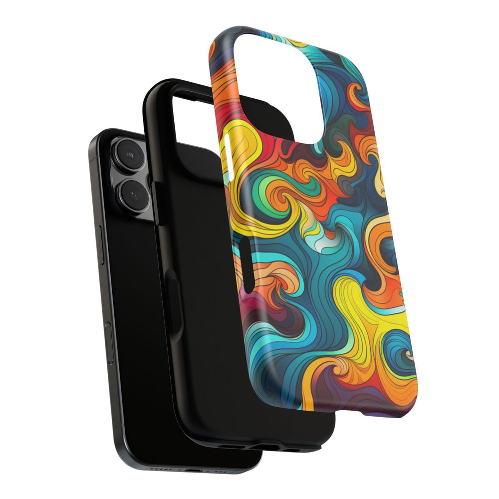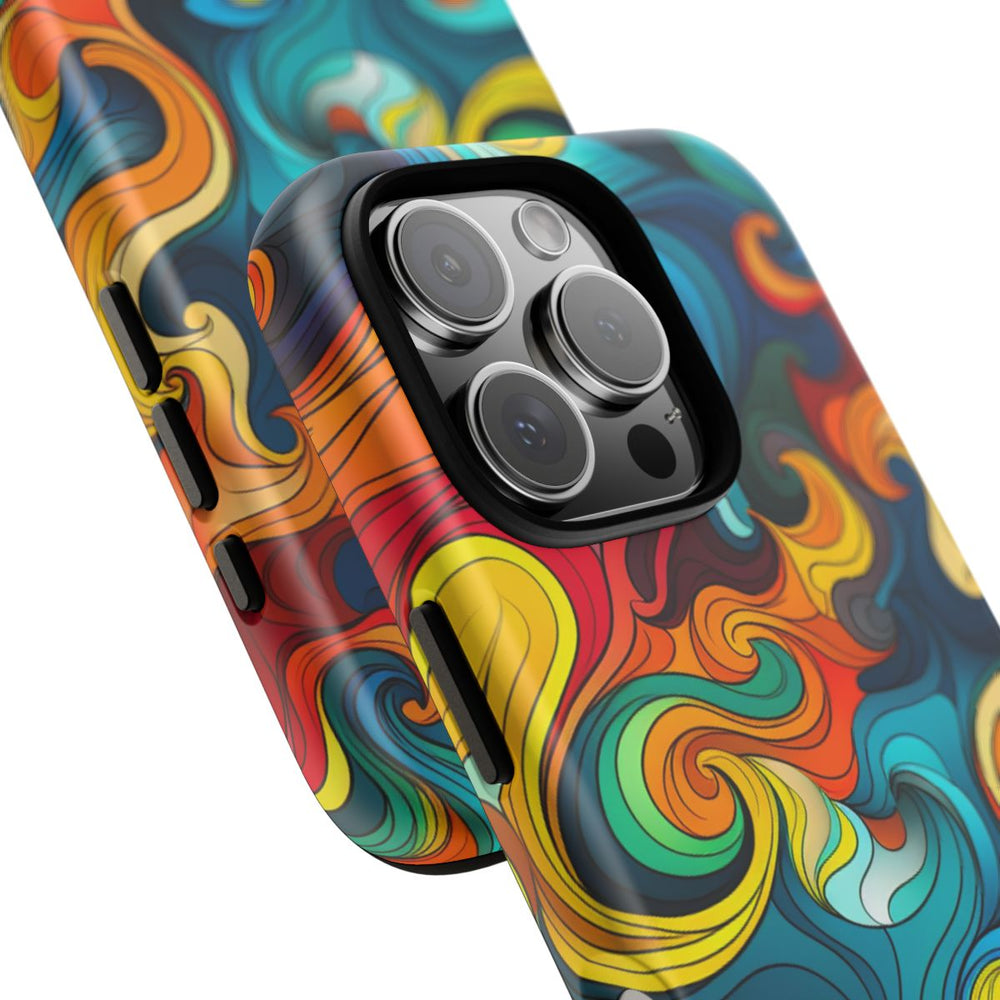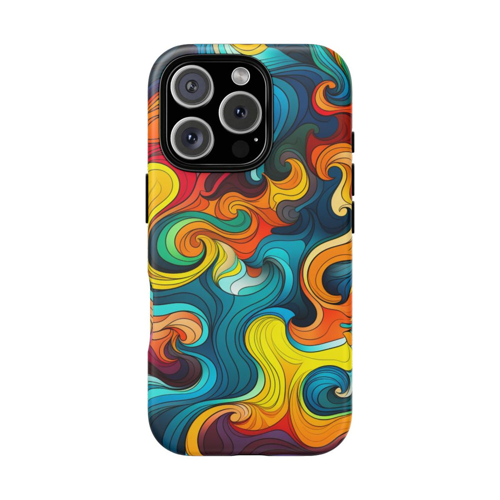 Dit hoesje heeft een opvallend ontwerp met kleurrijke, golvende patronen in onder andere rood, oranje, geel, turquoise en blauw. De vloeiende vormen zorgen voor een levendige en energieke uitstraling, ideaal voor iedereen die houdt van een gedurfd en kleurrijk design. Het hoesje bestaat uit twee lagen voor extra bescherming en is geschikt voor draadloos opladen. Het is speciaal ontworpen voor een perfecte pasvorm en laat het unieke patroon goed tot zijn recht komen.