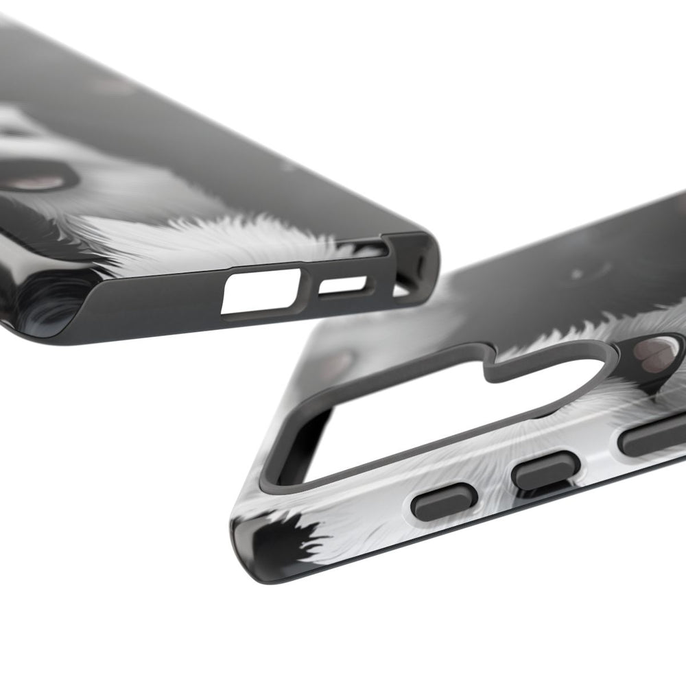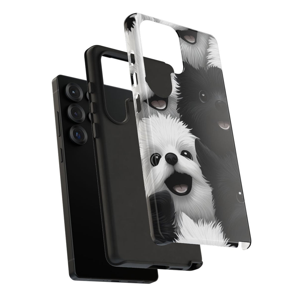 Dit ontwerp heeft een dicht, naadloos patroon van vrolijke hondenkopjes die dicht op elkaar zijn geplaatst, zonder zichtbare achtergrond. De honden zijn getekend in zwart-wittinten en tonen allemaal een blije uitdrukking met open mond en heldere ogen. De illustratie zorgt voor een schattige en levendige uitstraling. Dit glanzende en stevige hoesje bestaat uit een dubbele laag van polycarbonaat en TPU, waardoor het extra stevig is en optimale bescherming biedt. Het hoesje ondersteunt draadloos opladen.