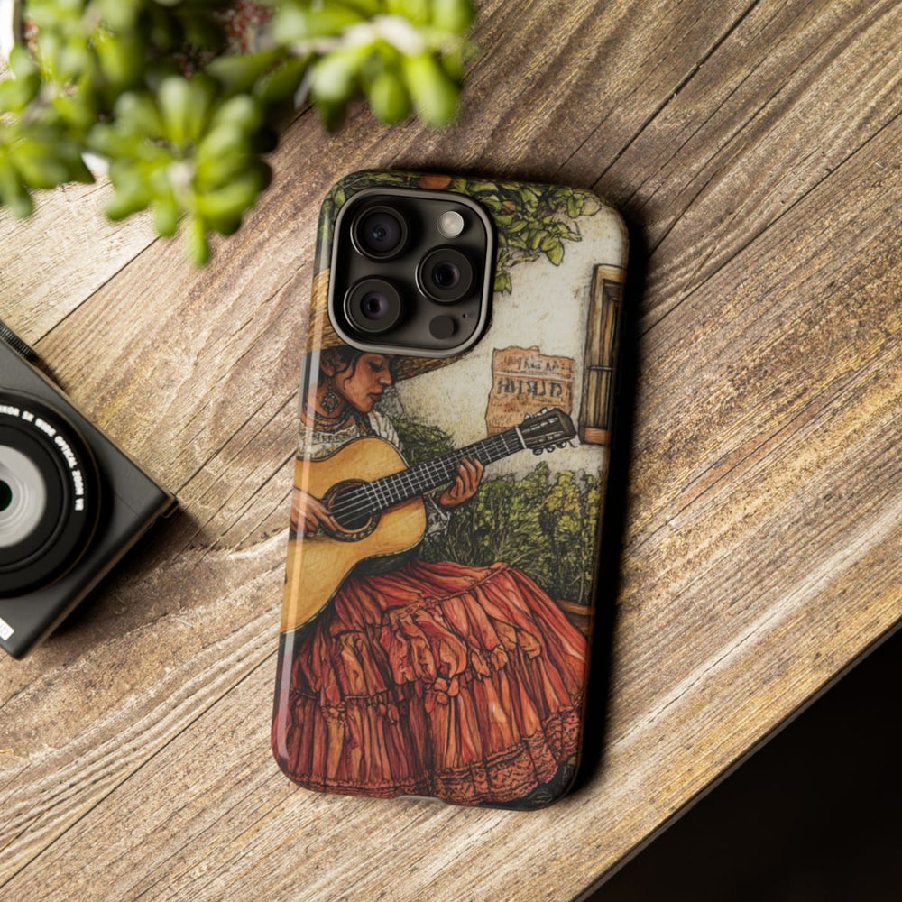 Dit hoesje toont een gedetailleerde illustratie van een vrouw die op een houten kruk zit en een akoestische gitaar bespeelt. Ze draagt een grote gevlochten hoed, een witte geborduurde blouse en een lange rode rok met verfijnde patronen. De scène speelt zich af op een landelijke binnenplaats met een stenen vloer, bloempotten en een oude witte muur met een raam voorzien van tralies. Sinaasappelbomen met rijpe vruchten zorgen voor een natuurlijke sfeer. De warme, aardse kleuren en de getekende textuur geven het ontwerp een handgemaakte uitstraling. Het hoesje is glanzend, stevig en biedt dubbele bescherming. Geschikt voor draadloos opladen.