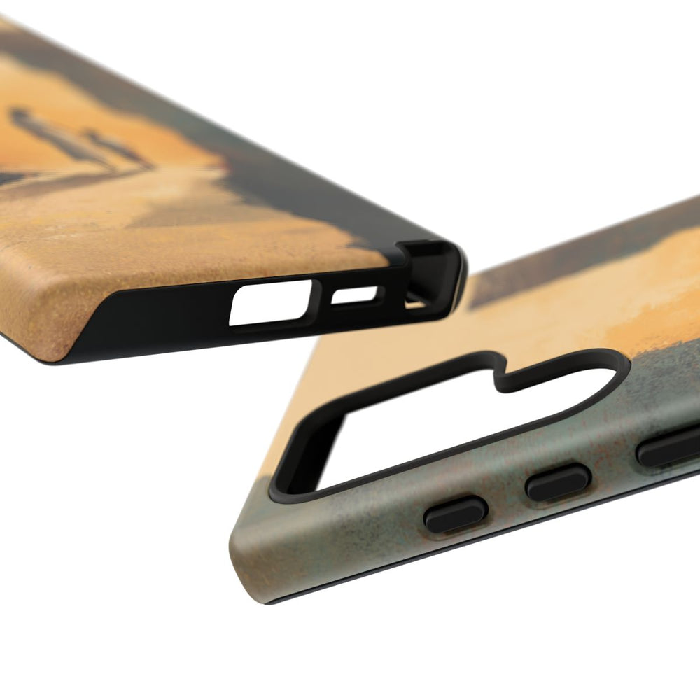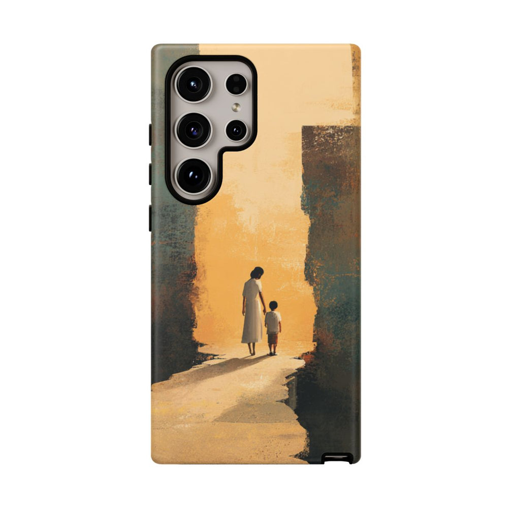 Dit hoesje toont een vrouw en een jong kind die hand in hand lopen over een gebroken pad. Op de achtergrond zijn grote, abstracte blokken te zien in rustige, warme tinten bruin, beige en blauwgroen. Het pad is gebarsten en ongelijk, en leidt naar een heldere, lichtgevende ruimte. De afbeelding is minimalistisch en heeft een zachte, textuurrijke uitstraling, wat zorgt voor een emotionele en bedachtzame sfeer. Het hoesje bestaat uit twee lagen: een stevige buitenkant van polycarbonaat en een TPU-binnenzijde. Dit zorgt voor optimale bescherming en maakt draadloos opladen mogelijk.
