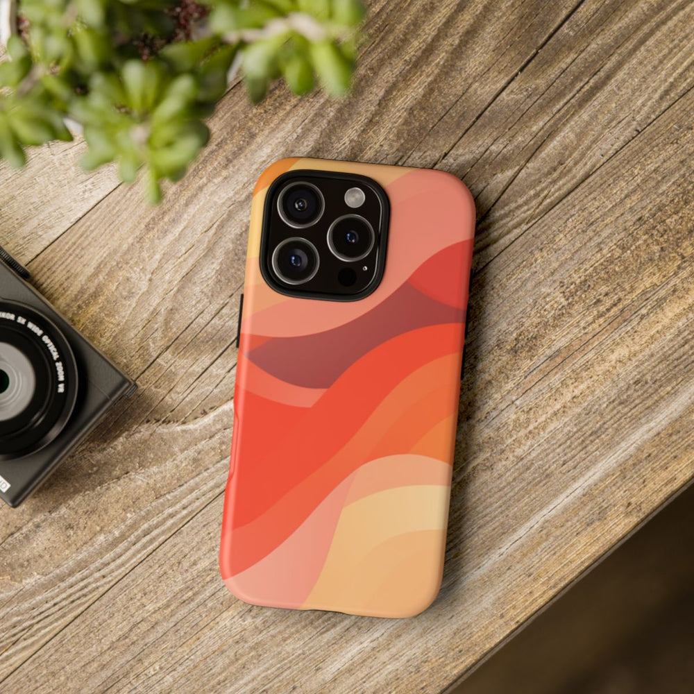 Dit hoesje heeft een abstract patroon van golvende, overlappende vormen in warme tinten oranje, rood, perzik en geel. De vloeiende lijnen en zachte kleuren zorgen voor een gevoel van beweging en warmte. De kleuren lopen subtiel in elkaar over en creëren een harmonieuze en uitnodigende uitstraling. Het patroon is gedrukt op een mat hoesje van polycarbonaat en TPU, dat bestaat uit twee beschermende lagen en geschikt is voor draadloos opladen.