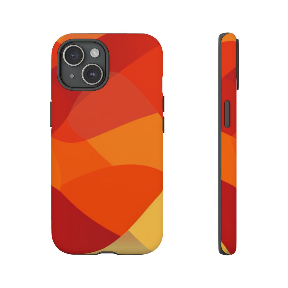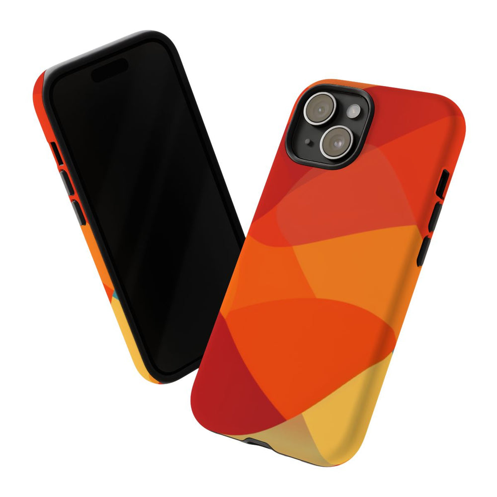 Dit hoesje is bedrukt met een abstract patroon van overlappende, gebogen vormen in warme kleuren zoals oranje, rood en geel. De vormen creëren een vloeiend, golvend effect, met één contrasterende teal-kleurige vorm die het ontwerp extra opvallend maakt. Het patroon is glad en doorschijnend, wat zorgt voor een gelaagde en dynamische uitstraling. Het hoesje heeft een matte afwerking en bestaat uit een stevige dubbele laag van polycarbonaat en TPU voor optimale bescherming en duurzaamheid. Ondersteunt draadloos opladen.