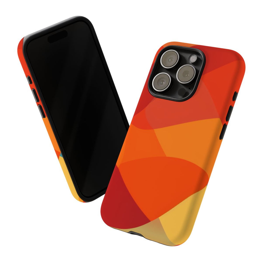Dit hoesje is bedrukt met een abstract patroon van overlappende, gebogen vormen in warme kleuren zoals oranje, rood en geel. De vormen creëren een vloeiend, golvend effect, met één contrasterende teal-kleurige vorm die het ontwerp extra opvallend maakt. Het patroon is glad en doorschijnend, wat zorgt voor een gelaagde en dynamische uitstraling. Het hoesje heeft een matte afwerking en bestaat uit een stevige dubbele laag van polycarbonaat en TPU voor optimale bescherming en duurzaamheid. Ondersteunt draadloos opladen.
