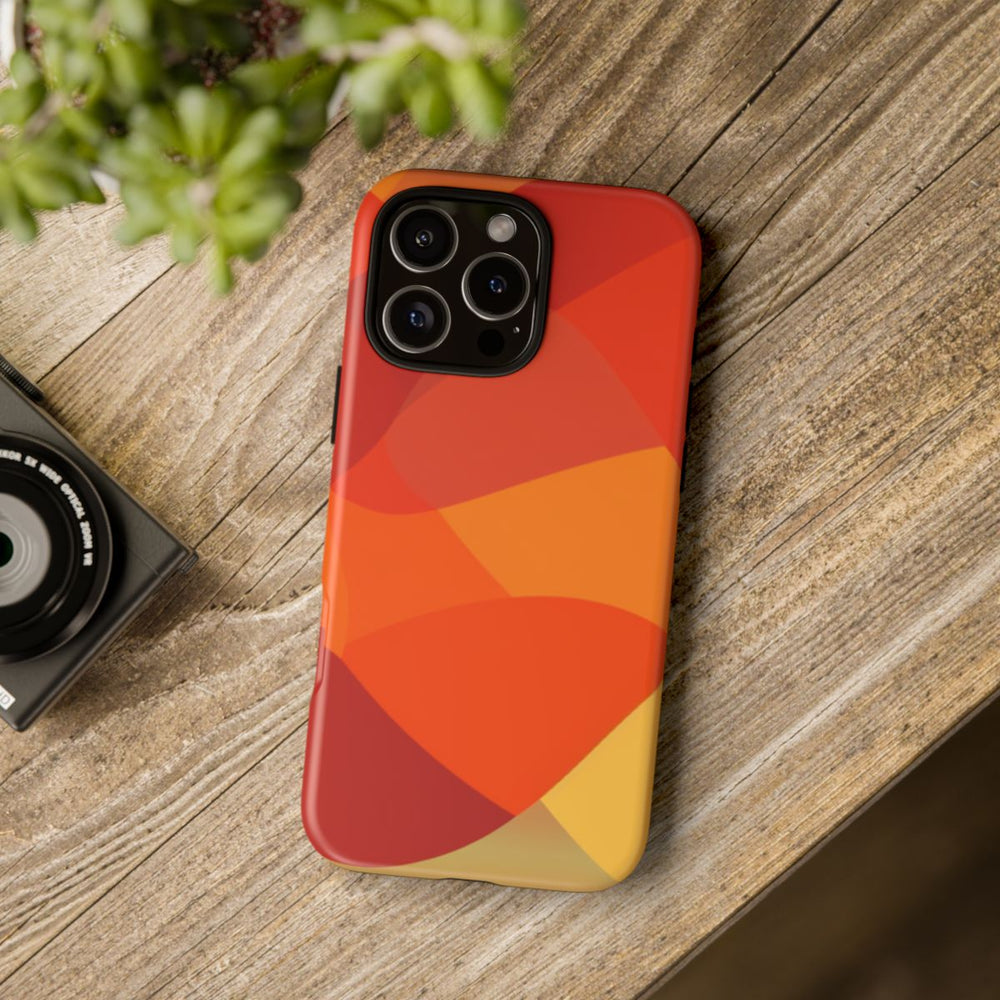 Dit hoesje is bedrukt met een abstract patroon van overlappende, gebogen vormen in warme kleuren zoals oranje, rood en geel. De vormen creëren een vloeiend, golvend effect, met één contrasterende teal-kleurige vorm die het ontwerp extra opvallend maakt. Het patroon is glad en doorschijnend, wat zorgt voor een gelaagde en dynamische uitstraling. Het hoesje heeft een matte afwerking en bestaat uit een stevige dubbele laag van polycarbonaat en TPU voor optimale bescherming en duurzaamheid. Ondersteunt draadloos opladen.