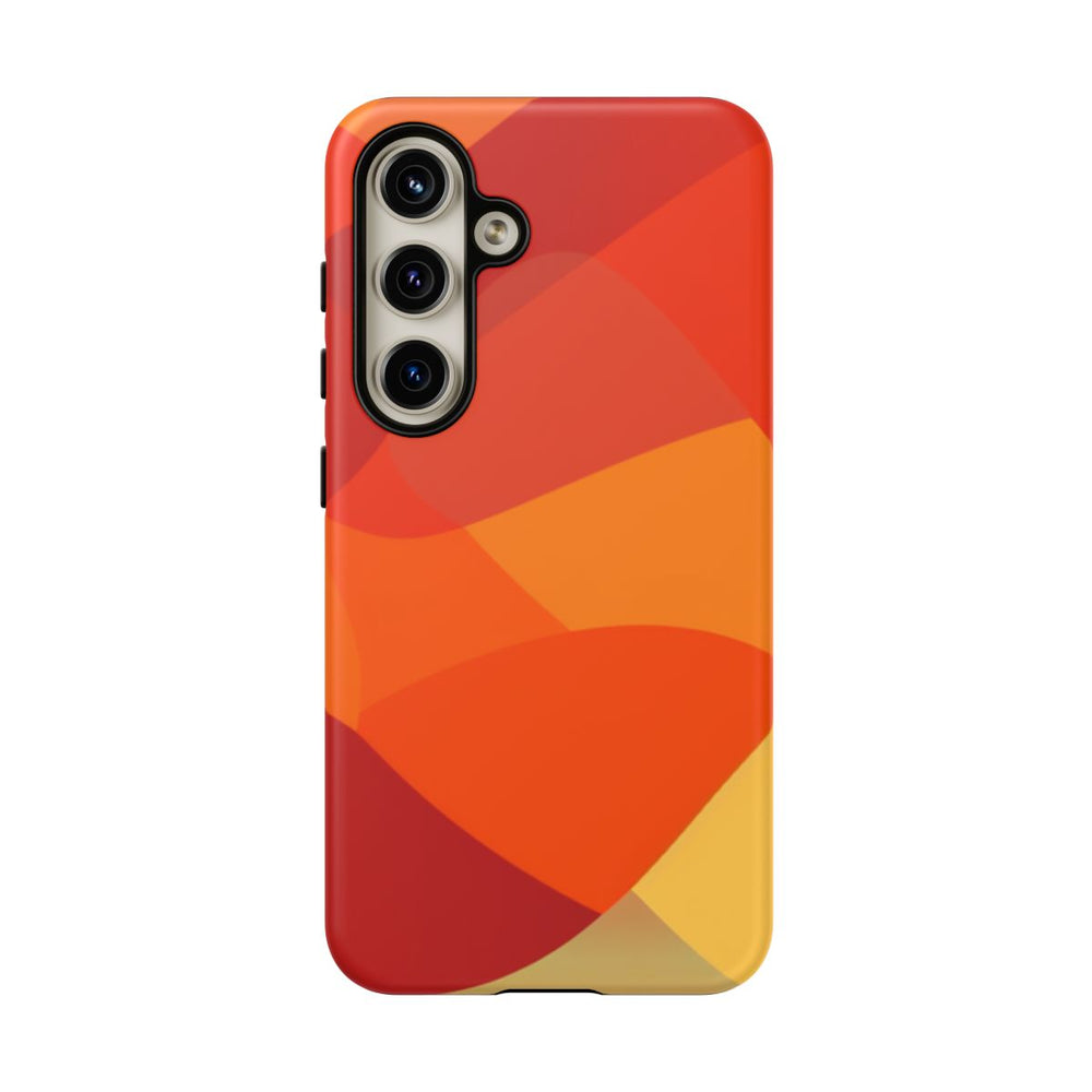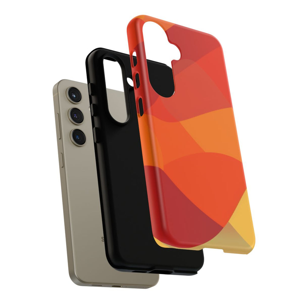 Dit hoesje is bedrukt met een abstract patroon van overlappende, gebogen vormen in warme kleuren zoals oranje, rood en geel. De vormen creëren een vloeiend, golvend effect, met één contrasterende teal-kleurige vorm die het ontwerp extra opvallend maakt. Het patroon is glad en doorschijnend, wat zorgt voor een gelaagde en dynamische uitstraling. Het hoesje heeft een matte afwerking en bestaat uit een stevige dubbele laag van polycarbonaat en TPU voor optimale bescherming en duurzaamheid. Ondersteunt draadloos opladen.