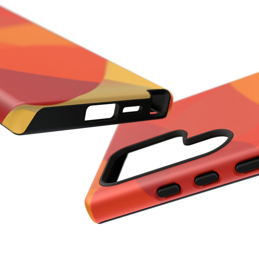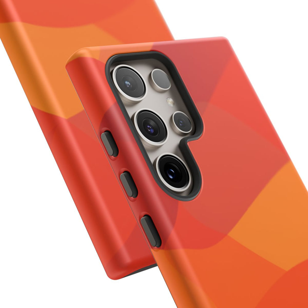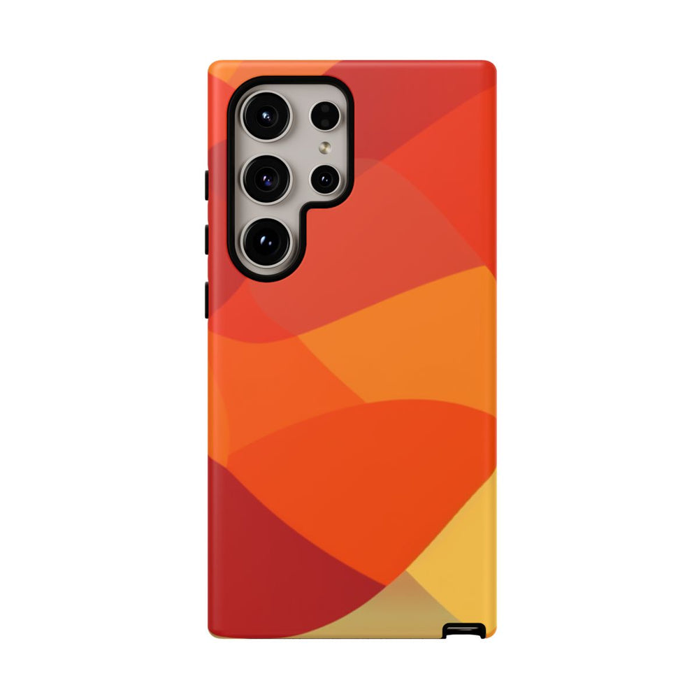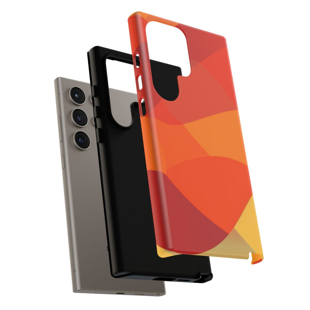 Dit hoesje is bedrukt met een abstract patroon van overlappende, gebogen vormen in warme kleuren zoals oranje, rood en geel. De vormen creëren een vloeiend, golvend effect, met één contrasterende teal-kleurige vorm die het ontwerp extra opvallend maakt. Het patroon is glad en doorschijnend, wat zorgt voor een gelaagde en dynamische uitstraling. Het hoesje heeft een matte afwerking en bestaat uit een stevige dubbele laag van polycarbonaat en TPU voor optimale bescherming en duurzaamheid. Ondersteunt draadloos opladen.