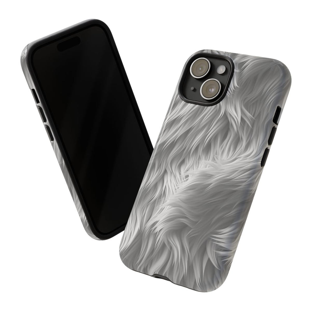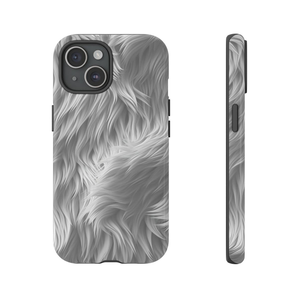 Dit hoesje heeft een gedetailleerd patroon van witte bontstructuur, met zachte, golvende haren die zorgen voor diepte en een levendig effect. De afbeelding toont een realistische en verfijnde weergave van bontachtige elementen in verschillende richtingen, wat het hoesje een tastbare en luxueuze uitstraling geeft. Het glanzende en stevige hoesje is opgebouwd uit twee lagen: een polycarbonaat buitenkant en een TPU-binnenzijde, voor extra stevigheid en optimale bescherming. Het hoesje ondersteunt draadloos opladen en het oppervlak is uitstekend bestand tegen weersinvloeden, waardoor de optische kwaliteit langdurig behouden blijft.