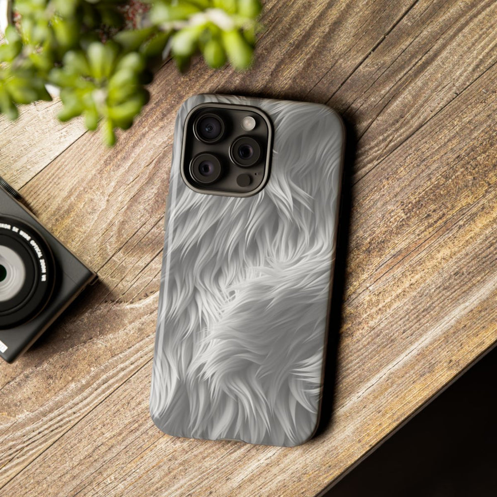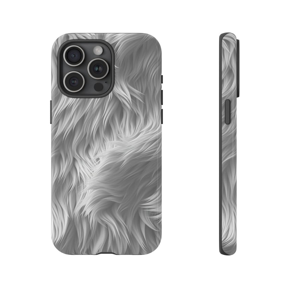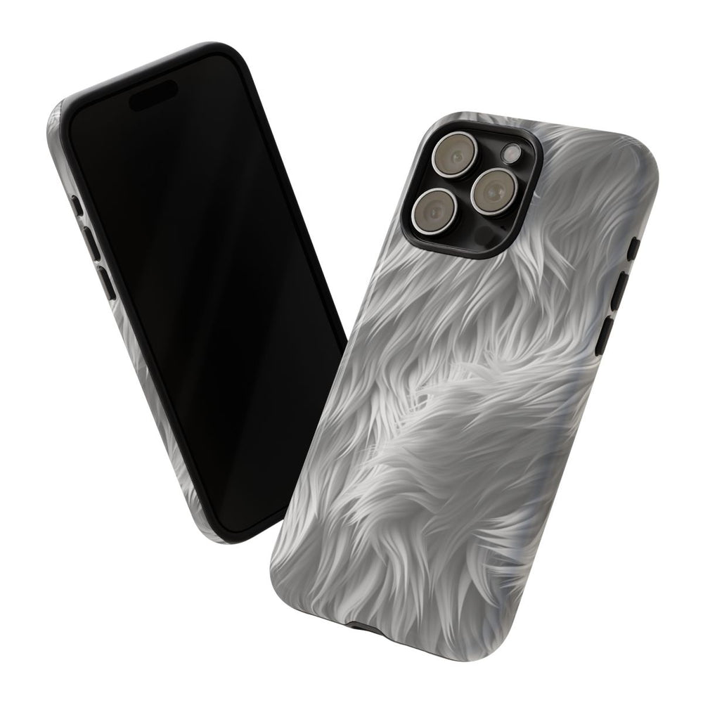Dit hoesje heeft een gedetailleerd patroon van witte bontstructuur, met zachte, golvende haren die zorgen voor diepte en een levendig effect. De afbeelding toont een realistische en verfijnde weergave van bontachtige elementen in verschillende richtingen, wat het hoesje een tastbare en luxueuze uitstraling geeft. Het glanzende en stevige hoesje is opgebouwd uit twee lagen: een polycarbonaat buitenkant en een TPU-binnenzijde, voor extra stevigheid en optimale bescherming. Het hoesje ondersteunt draadloos opladen en het oppervlak is uitstekend bestand tegen weersinvloeden, waardoor de optische kwaliteit langdurig behouden blijft.