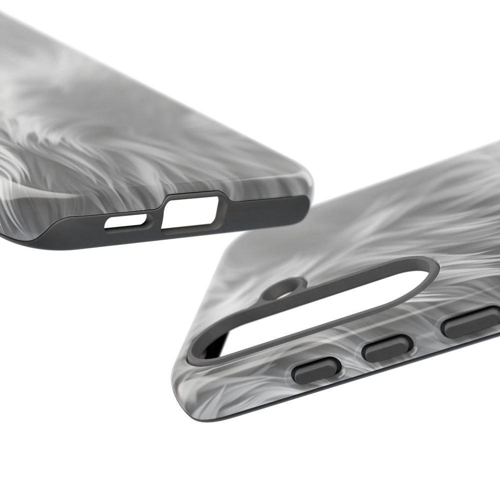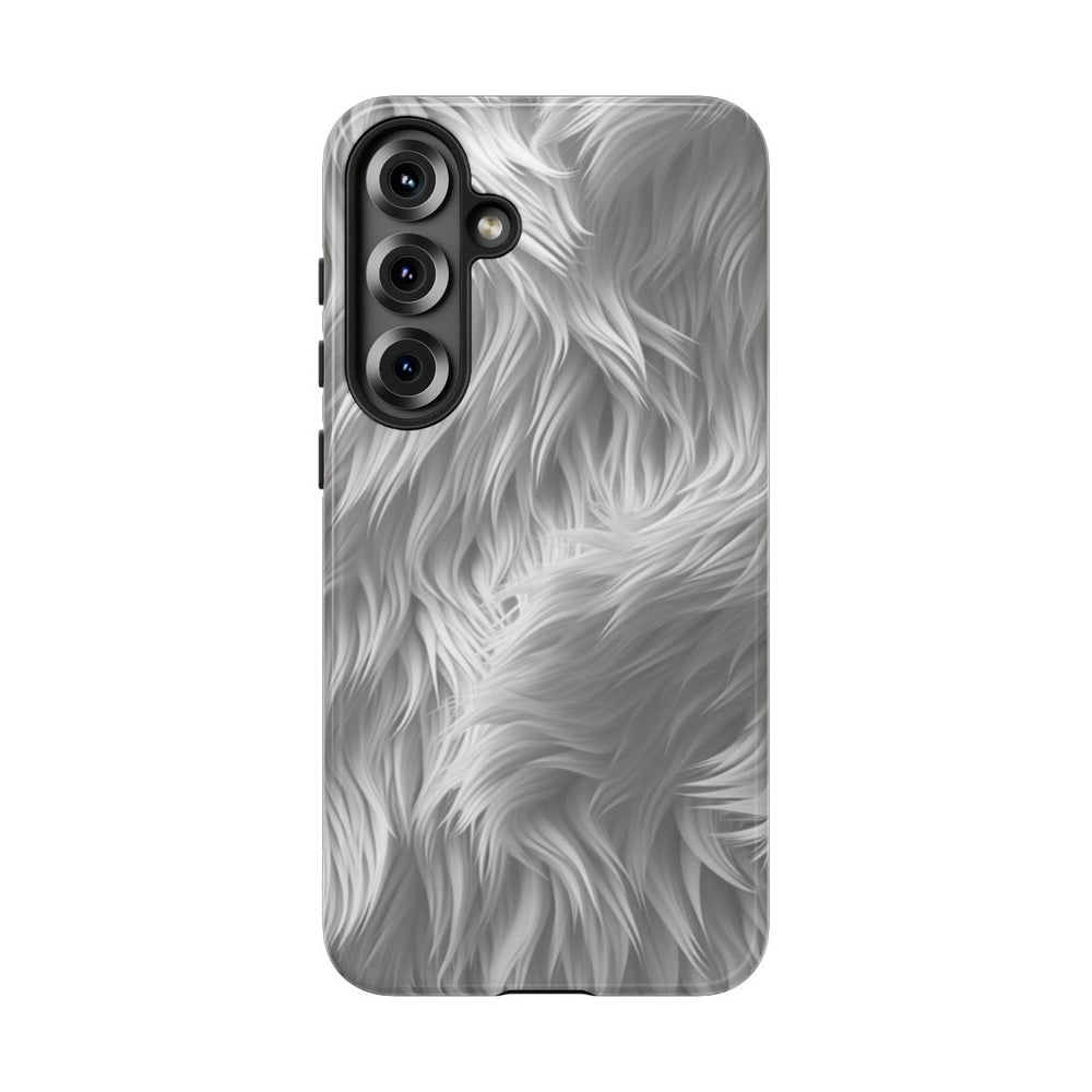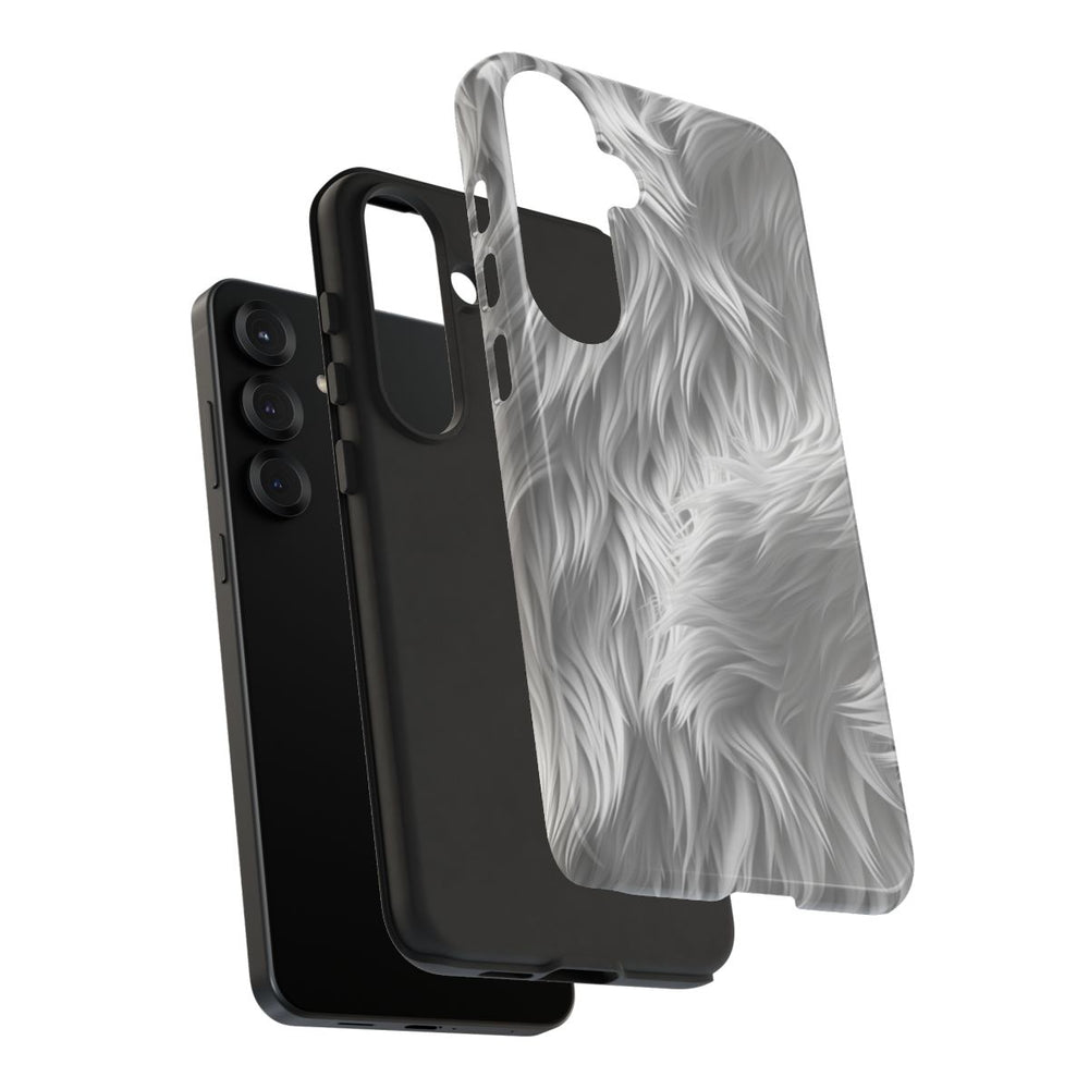 Dit hoesje heeft een gedetailleerd patroon van witte bontstructuur, met zachte, golvende haren die zorgen voor diepte en een levendig effect. De afbeelding toont een realistische en verfijnde weergave van bontachtige elementen in verschillende richtingen, wat het hoesje een tastbare en luxueuze uitstraling geeft. Het glanzende en stevige hoesje is opgebouwd uit twee lagen: een polycarbonaat buitenkant en een TPU-binnenzijde, voor extra stevigheid en optimale bescherming. Het hoesje ondersteunt draadloos opladen en het oppervlak is uitstekend bestand tegen weersinvloeden, waardoor de optische kwaliteit langdurig behouden blijft.