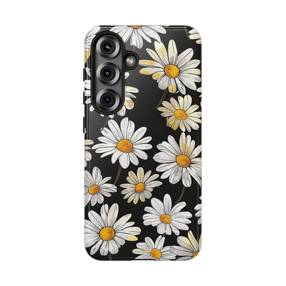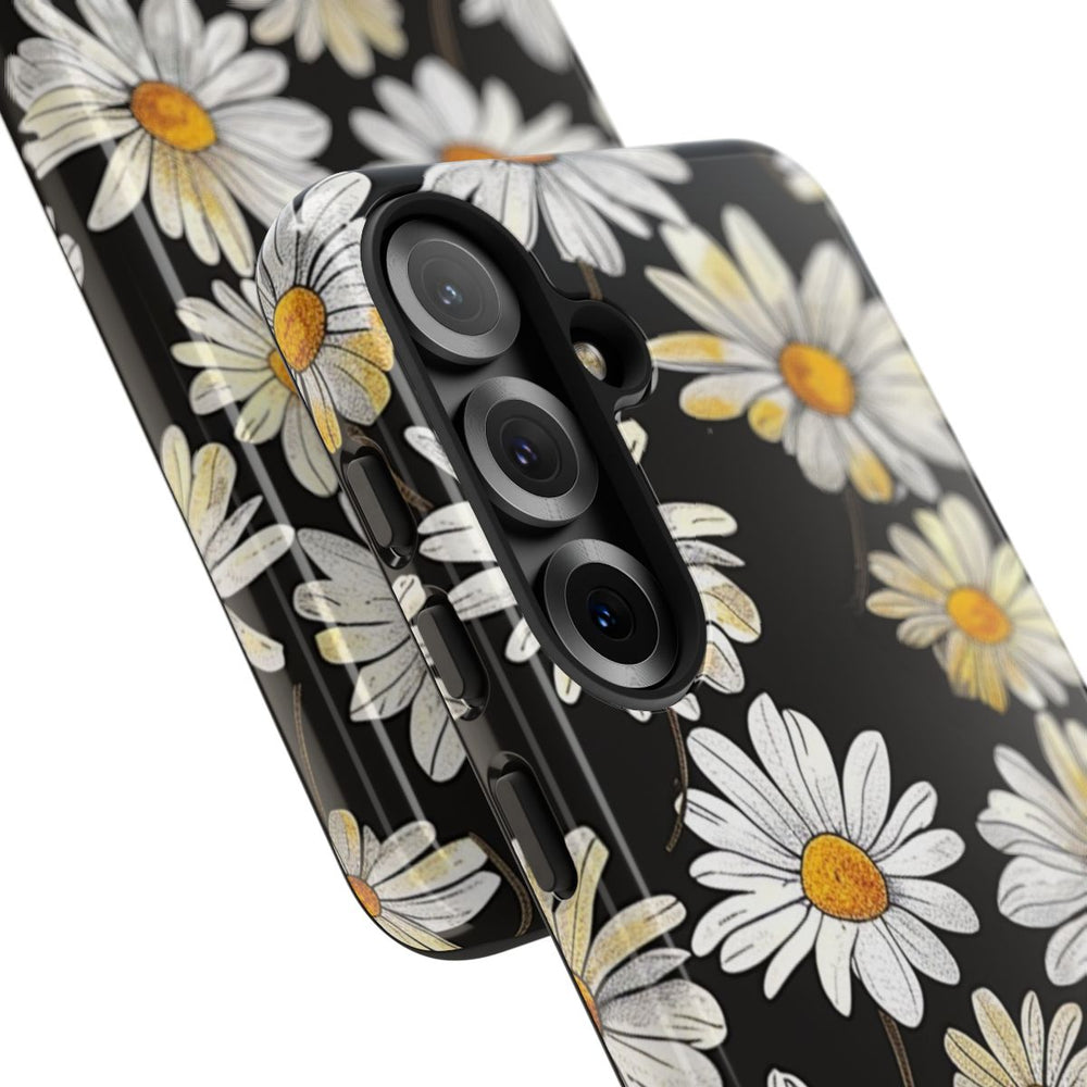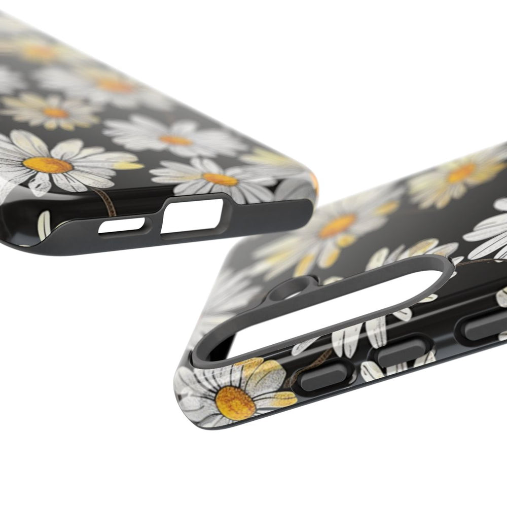 Dit hoesje is versierd met een herhalend patroon van grote, witgekleurde madeliefjes met gele harten op een effen zwarte achtergrond. De bloemen zijn gelijkmatig verdeeld en verschillen subtiel in formaat, wat zorgt voor een levendig en vrolijk bloemenmotief. Het hoesje heeft een glanzende afwerking en is extra stevig dankzij de dubbele laag van een polycarbonaat buitenkant en een TPU-binnenvoering. Dit biedt optimale bescherming en duurzaamheid. Het hoesje ondersteunt draadloos opladen en is bestand tegen weersinvloeden, zodat het zijn heldere uitstraling langdurig behoudt.
