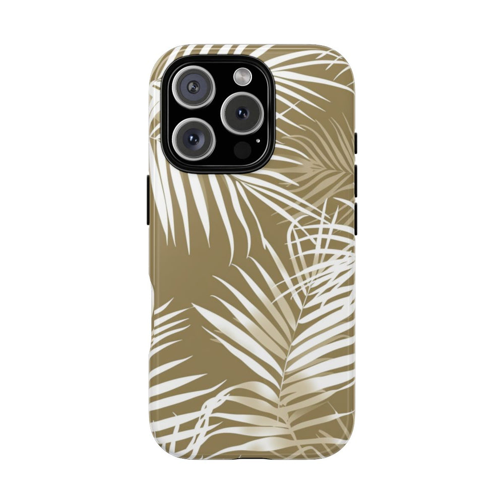 Dit telefoonhoesje heeft een naadloos patroon van witte palmbladeren op een khaki achtergrond. De palmbladeren verschillen in grootte en richting, wat zorgt voor een natuurlijke en tropische uitstraling. Het patroon loopt vloeiend door, waardoor het hoesje rondom mooi bedekt is. Het glanzende, stevige hoesje bestaat uit een dubbele laag met een polycarbonaat buitenkant en een TPU binnenzijde voor extra stevigheid en bescherming. Geschikt voor draadloos opladen en bestand tegen weersinvloeden.